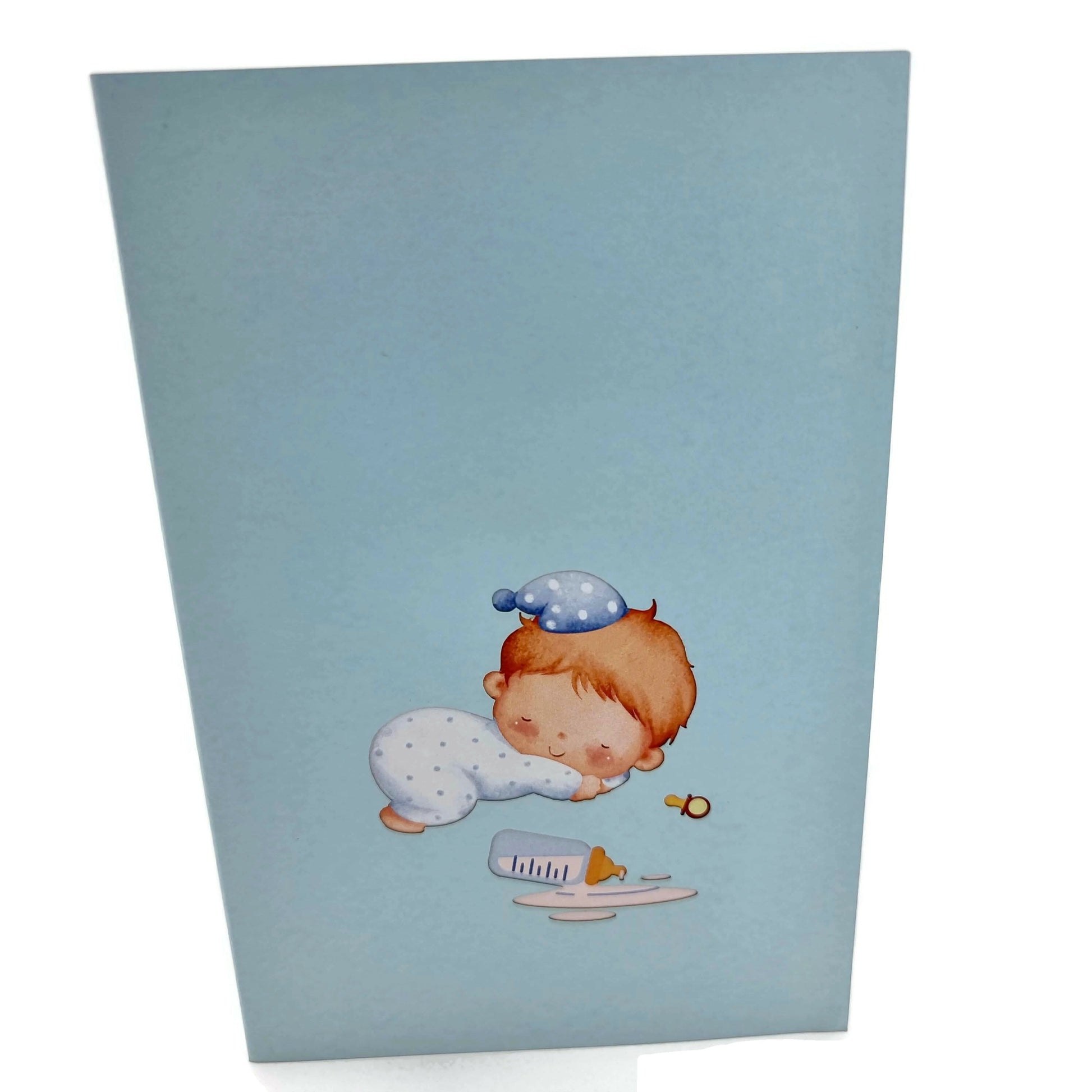 An outline of a cute baby sleeping with its head on the pillow is featured on the blue front cover of this cute card. Open the card to find the 3d cot with the new baby sleeping inside.