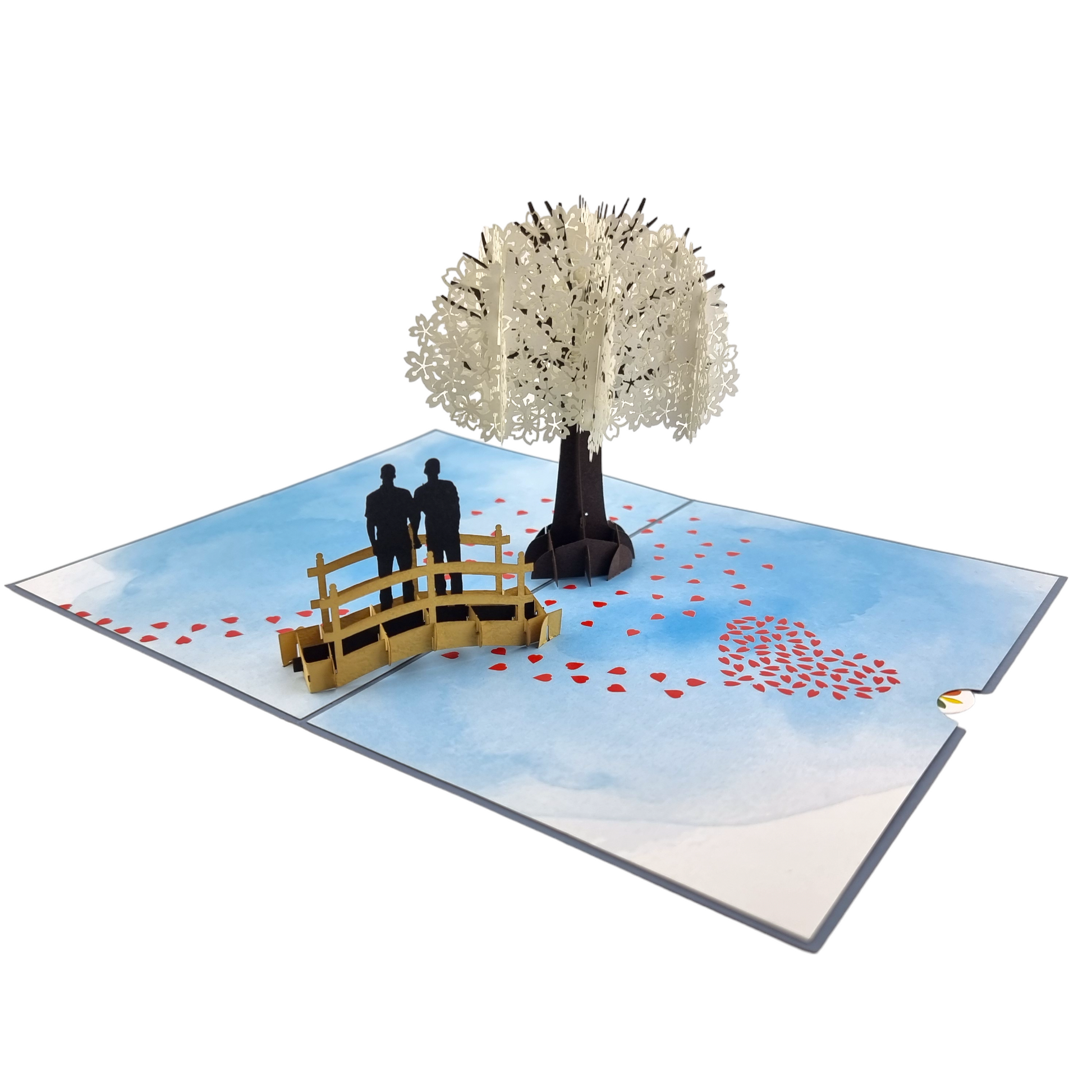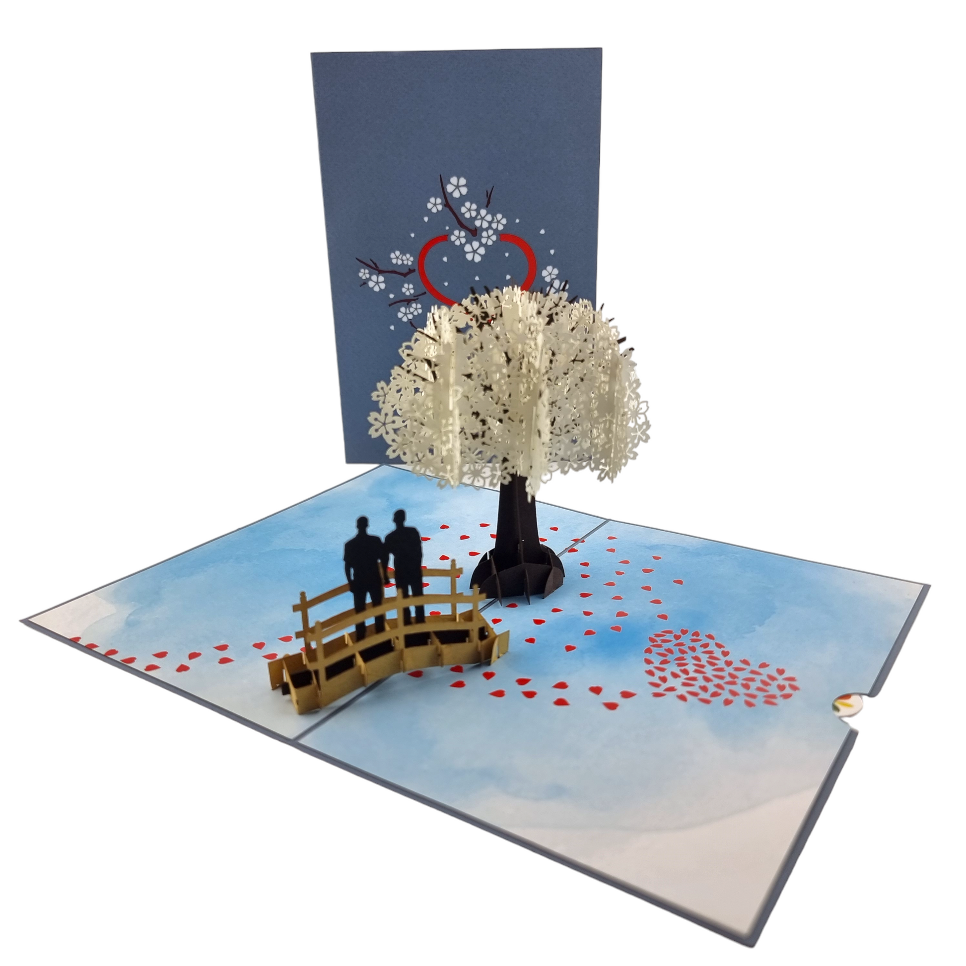 This pop-up card features a heart made from red and white cherry blossom sprigs on the front. Upon opening, you'll be greeted by a beautiful white cherry blossom tree in full bloom, with a charming same-sex male couple strolling hand in hand over a bridge. The finishing touch is a shower of petals forming a heart shape just below the bridge. Perfect for any romantic occasion, this card makes it easy to express your love. Use it for Valentine's Day, anniversaries, weddings, engagements, and more. The card measures 12 x 18 cm (4.7 x 7 inches), comes with an envelope, and has a removable note for your personalized message.