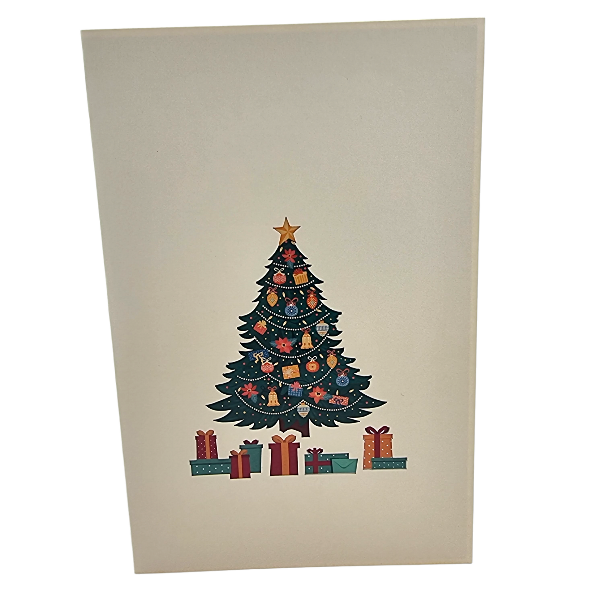 The front of this marvellous card offers an outline of a Christmas Tree surrounded by presents. When opened you are presented with a 3D Christmas Tree, adorned with ornaments and a star on top. Who wouldn't grin at this unique and jubilant vision? Use it as a Christmas card, holiday party invite, or simply treasure it for yourself. The card is 12 x 18 cm (4.7 x 7 inches) and is accompanied by an envelope, plus a slide-out note.
