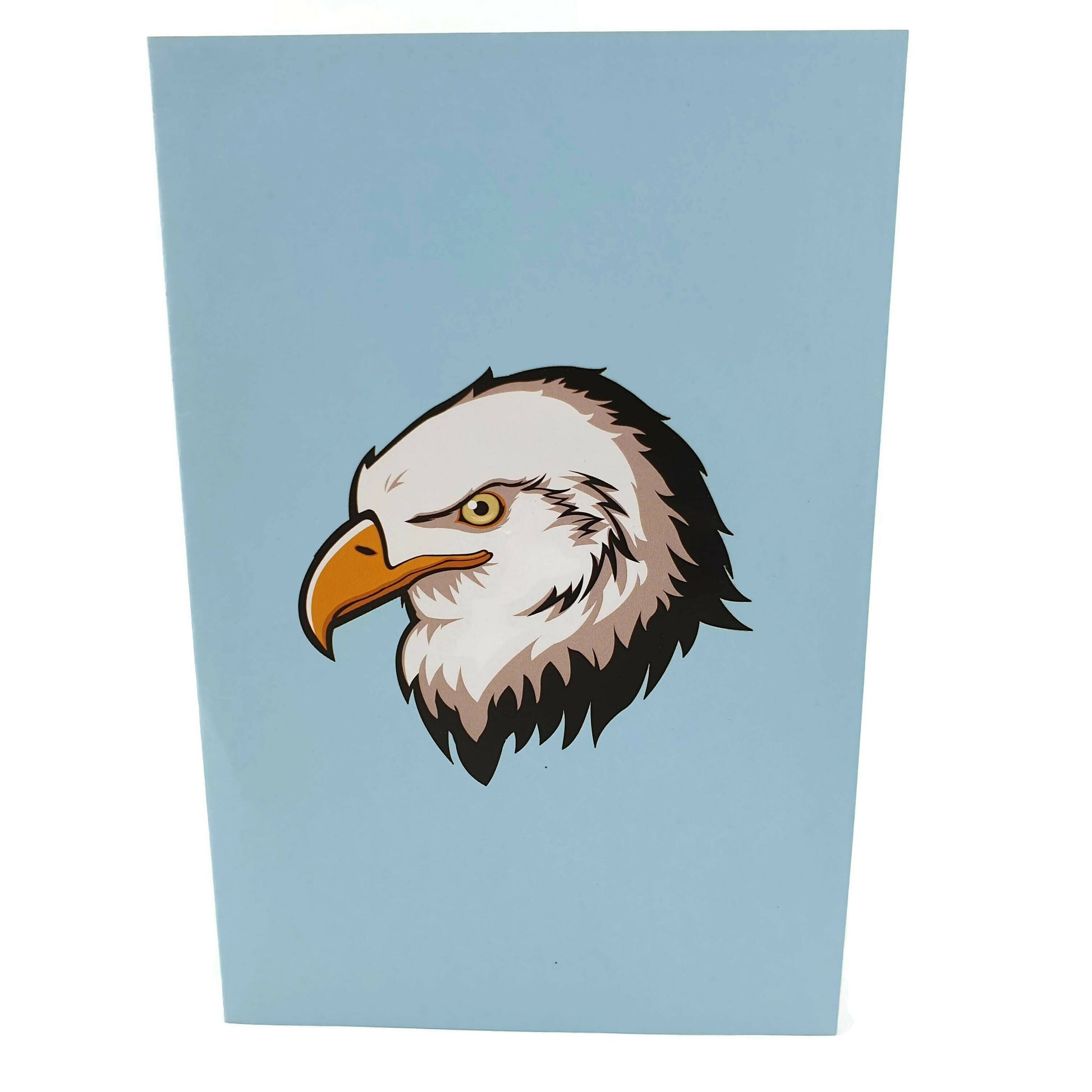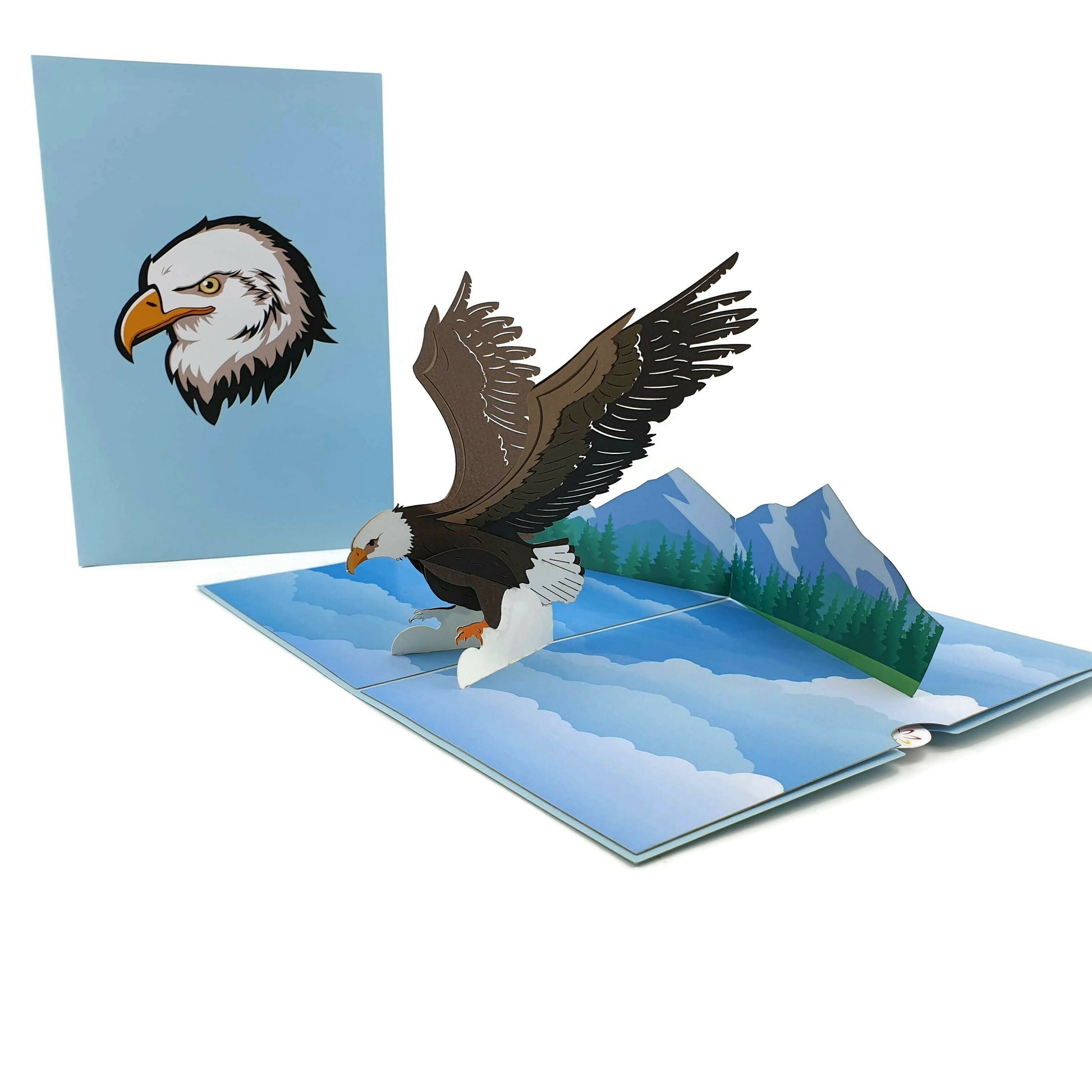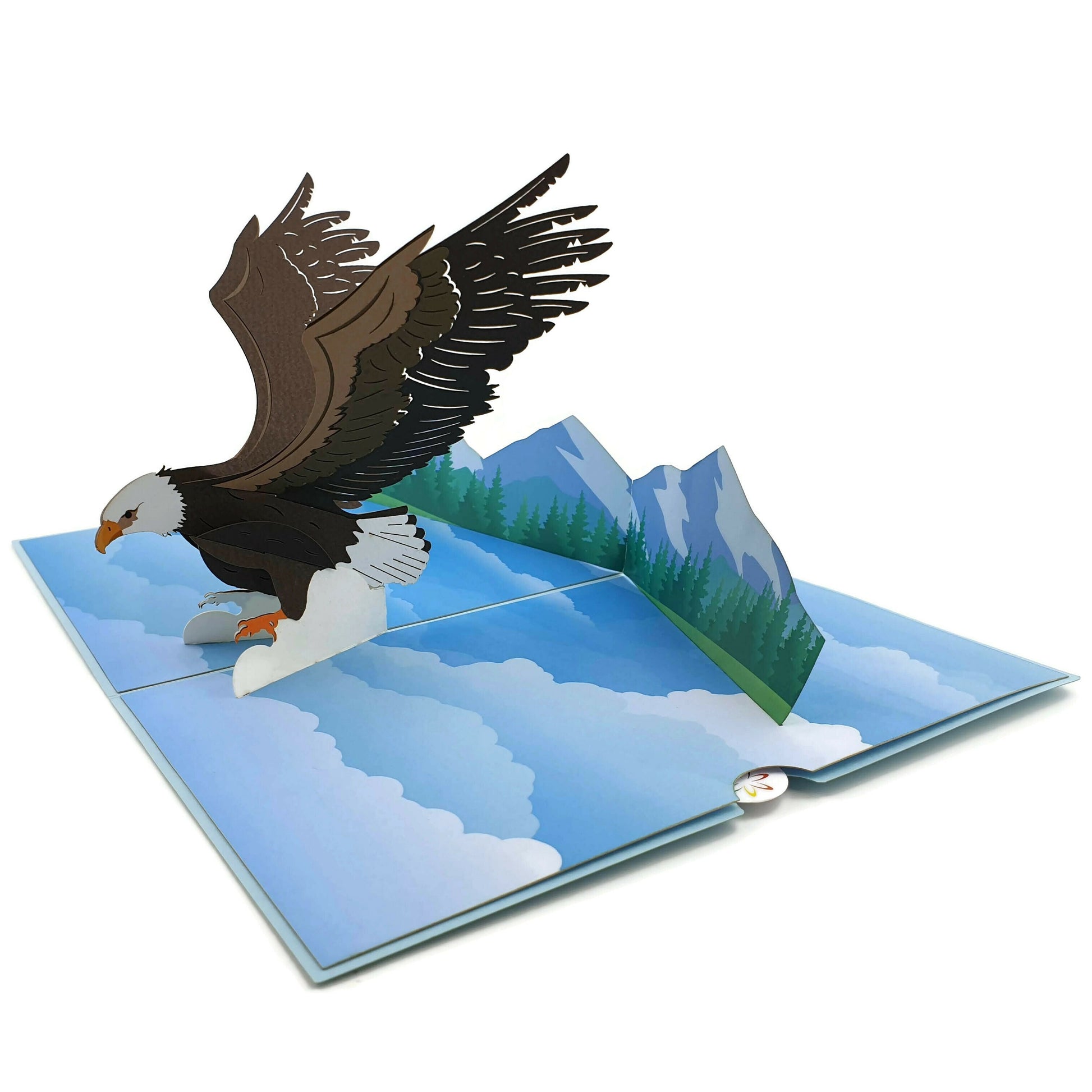 The cover of this card depicts the face of an eagle. Open the card and be blown away as a 3d rendering of the eagle can be found with its wings spread as it fly's across a blue sky with trees and a mountain range in the background.