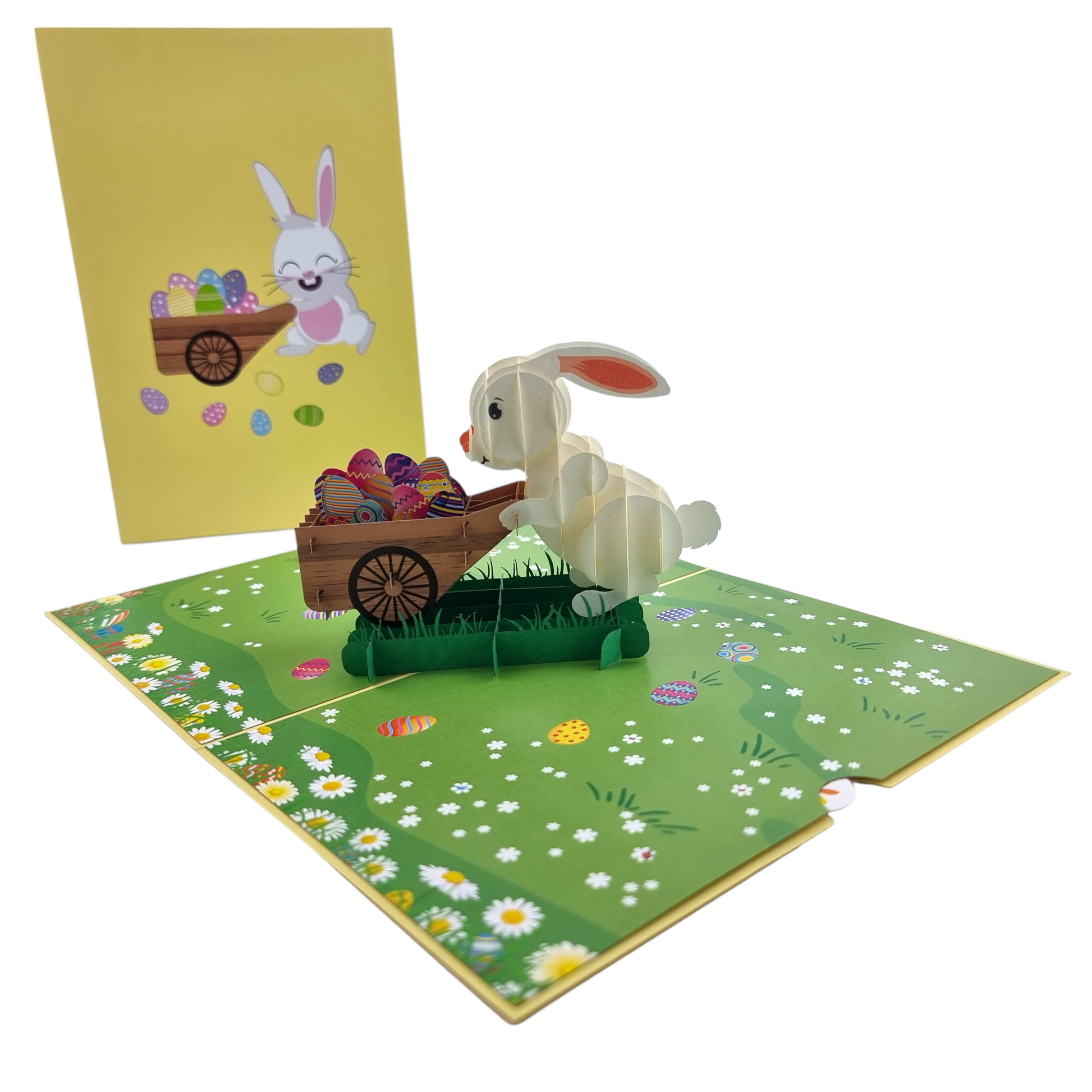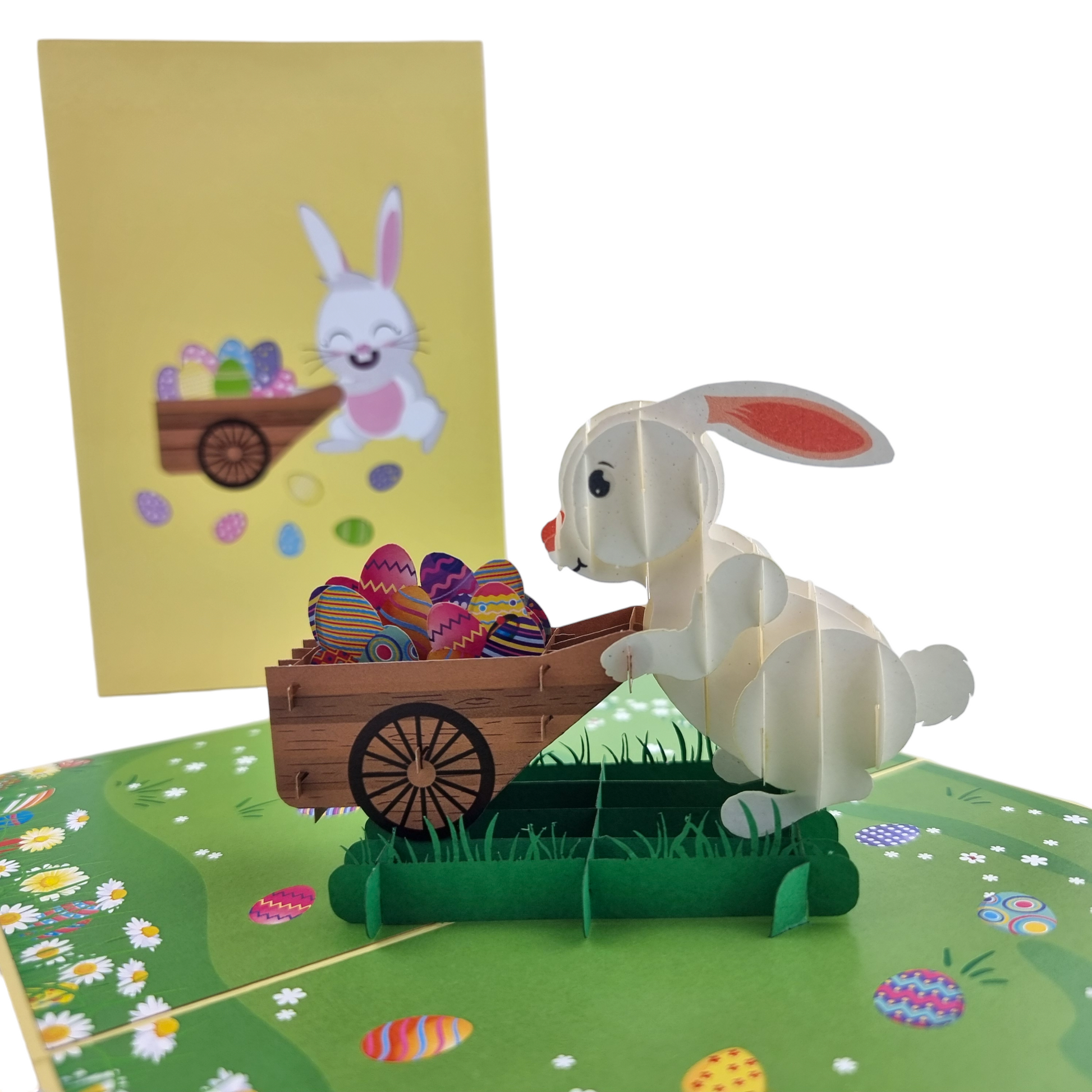 The cover of this card features the Easter Bunny and a barrow full of Easter Eggs. Open the card to reveal the Easter Bunny pushing a barrow full of colourful Easter eggs that he has just found down a garden path.