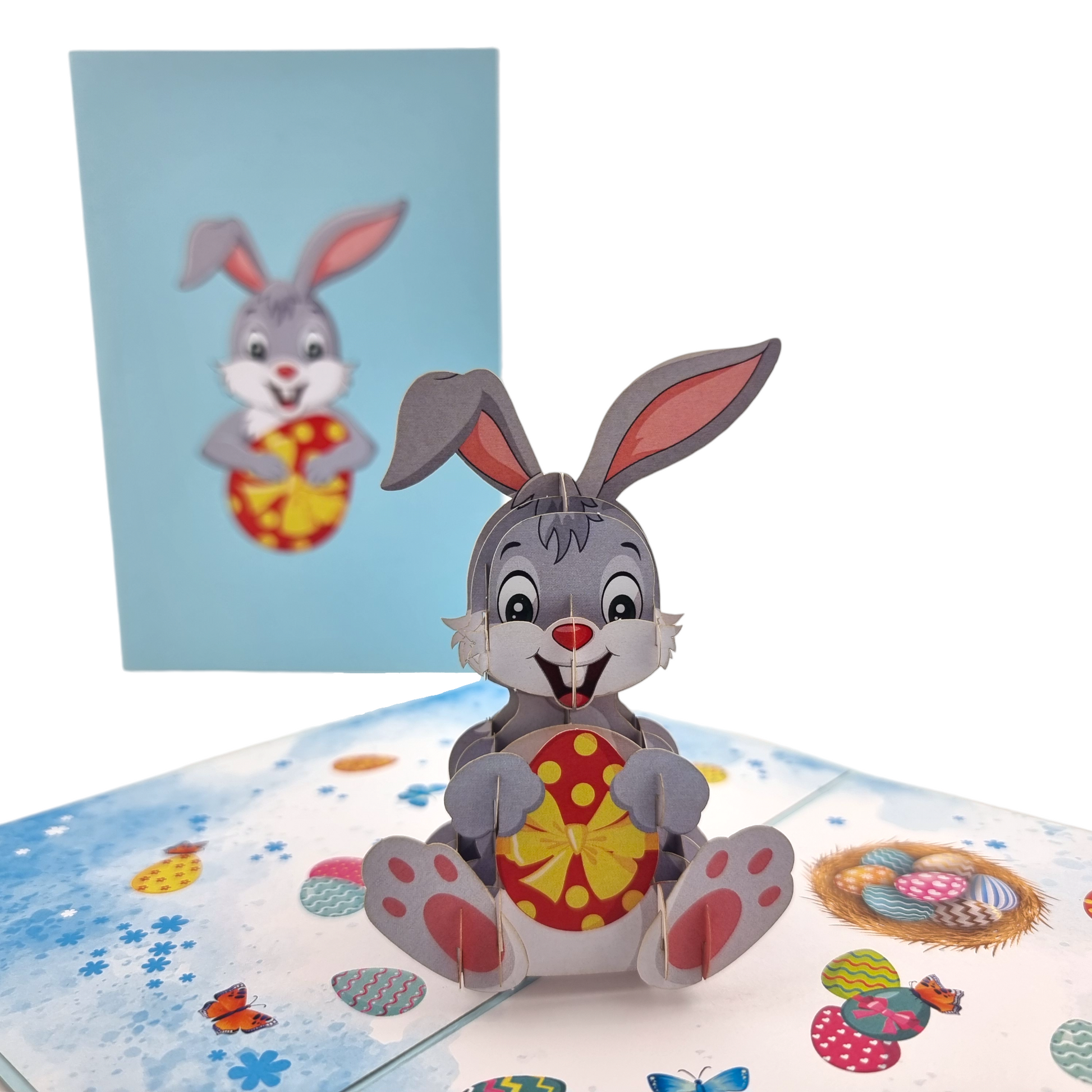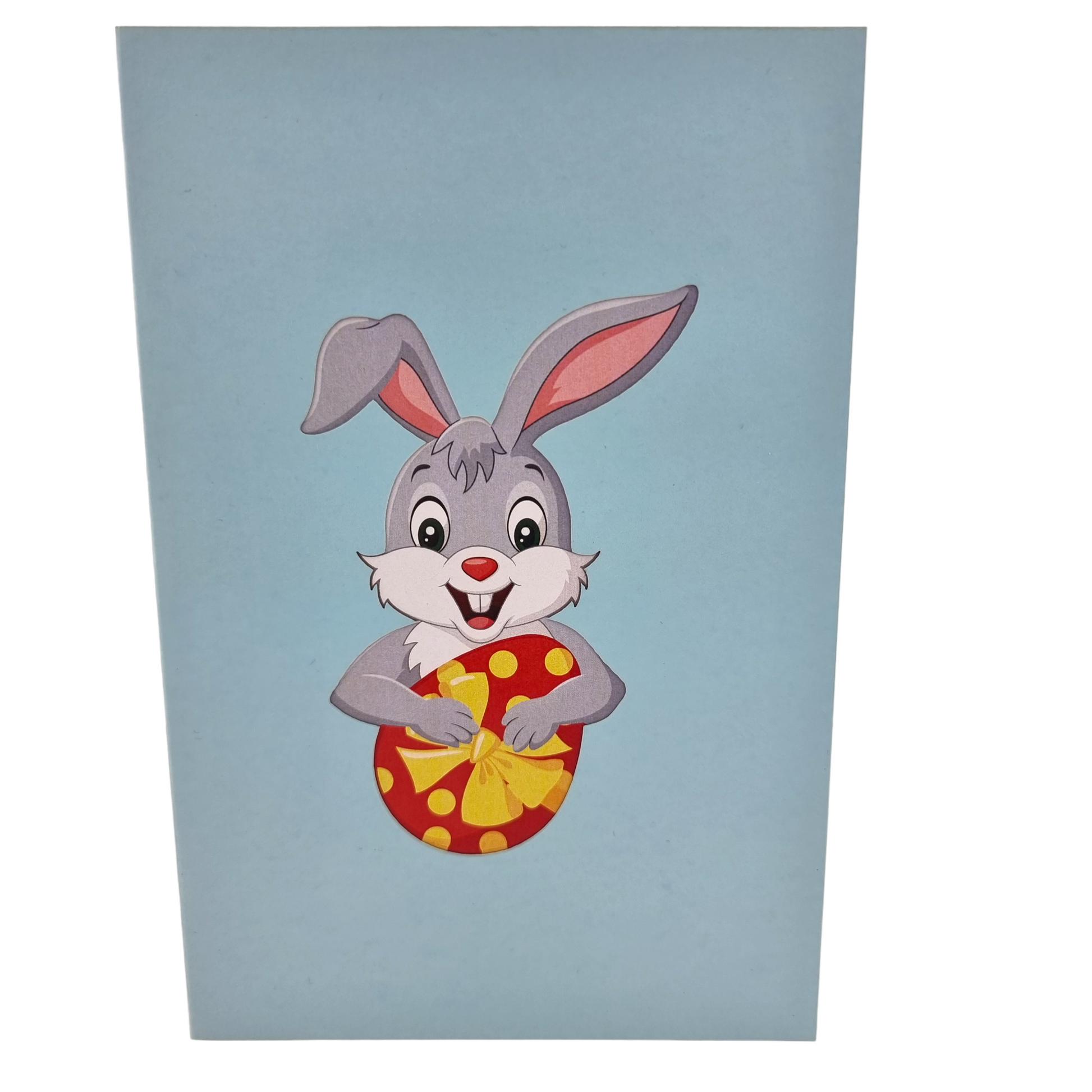 This card has an egg-citing cover featuring the Easter Bunny holding an egg with a bow. Open it up to find the same Bunny sitting on a field of eggs, holding yet another egg! Measuring 12 x 18 cm (4.7 x 7 inches), this card comes with an envelope and a slide-out note for your egg-cellent message.