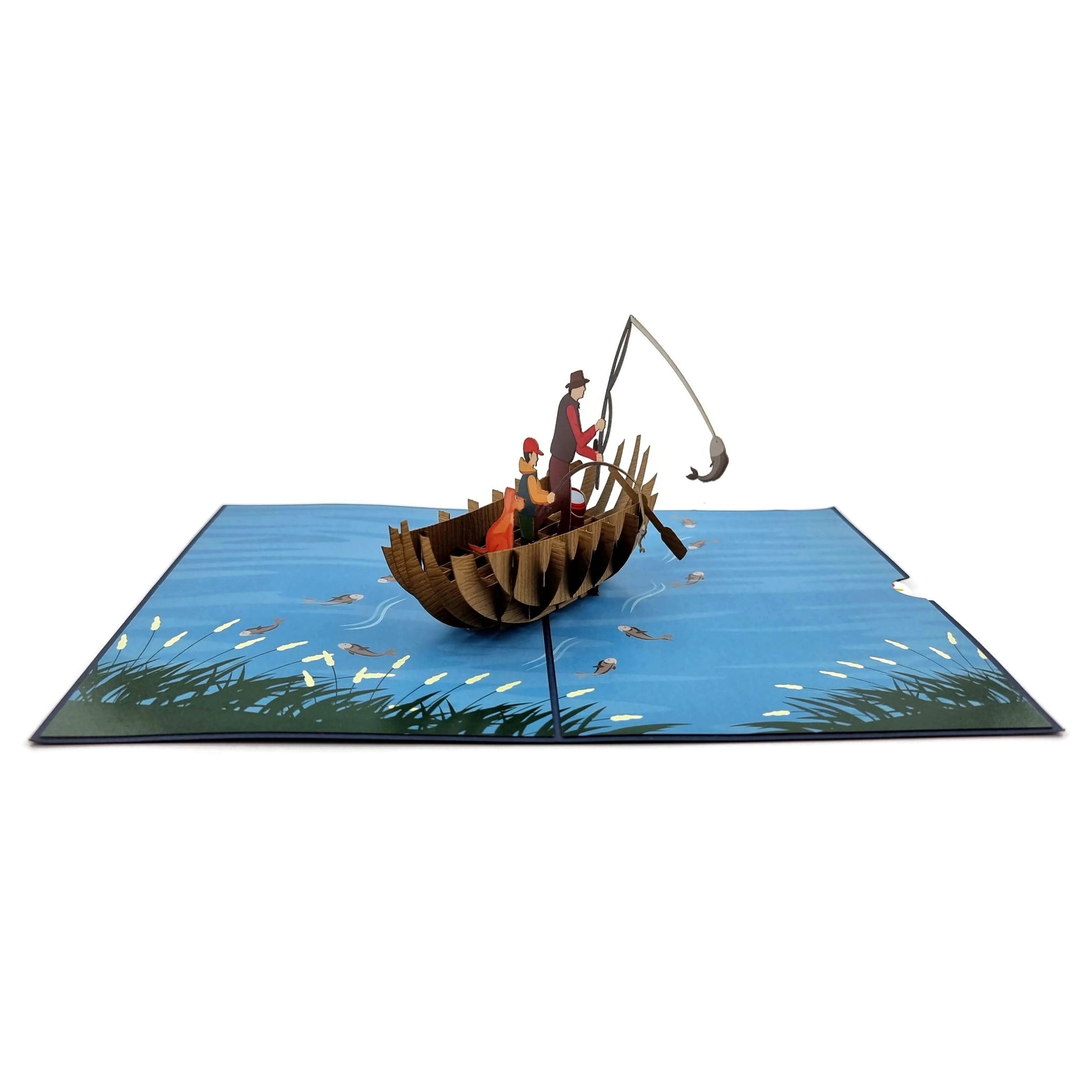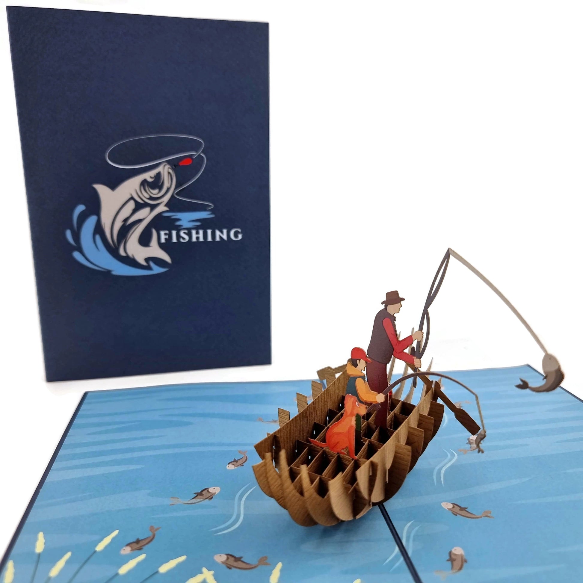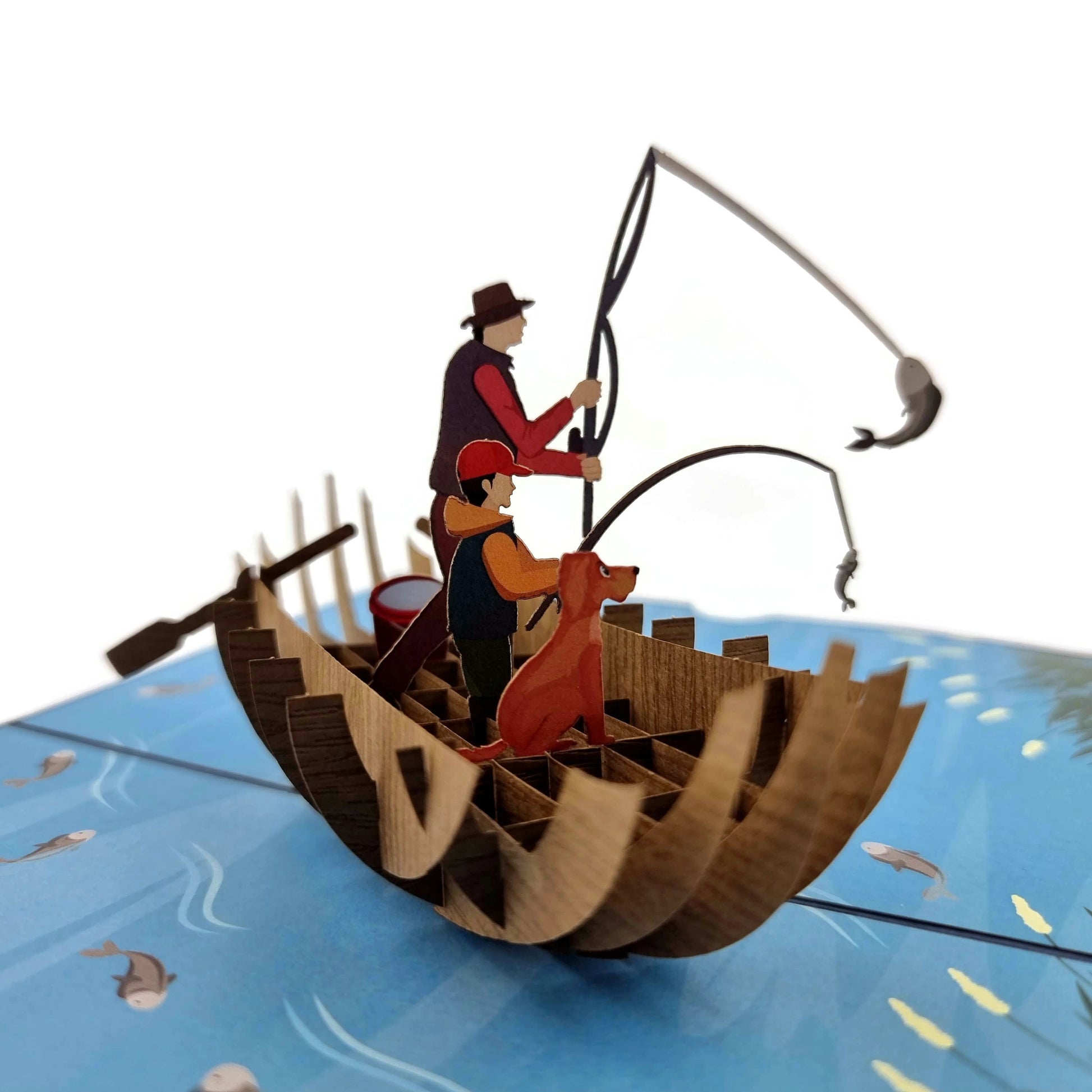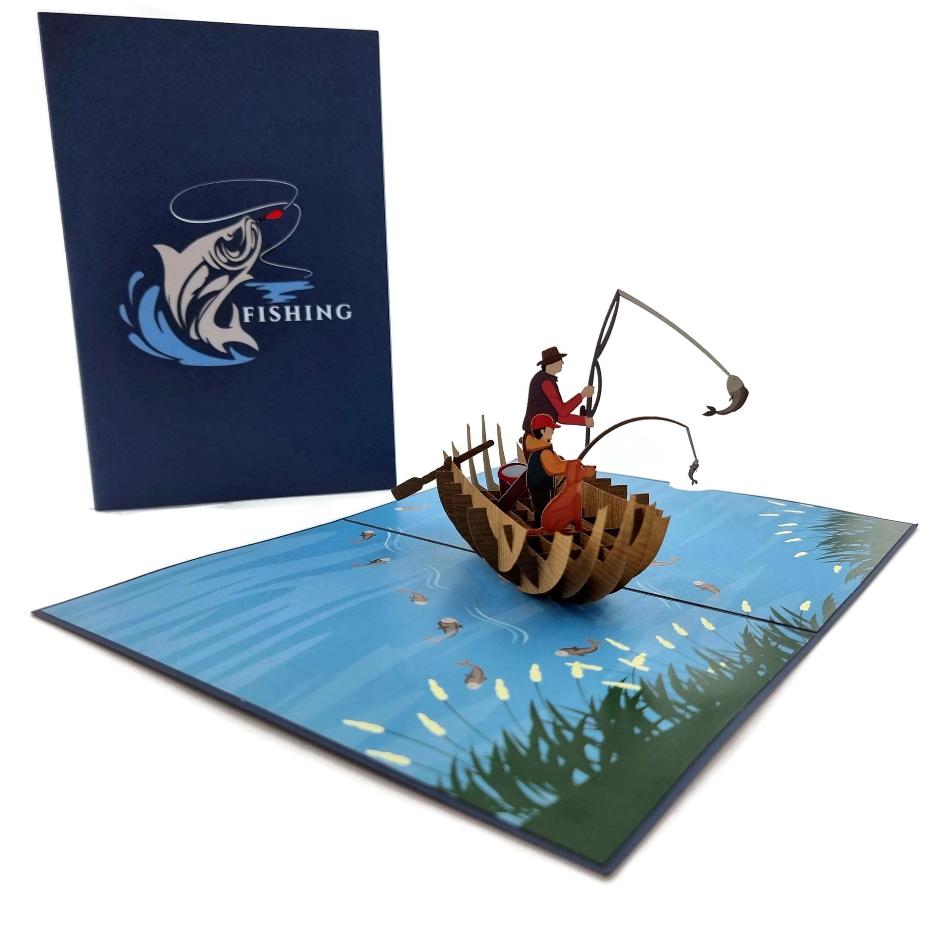 The silhouette of a fish on a line and the word fishing graces the cover of this card, open the card and find a dad, his son and dog in a 3d boat on the river catching fish.