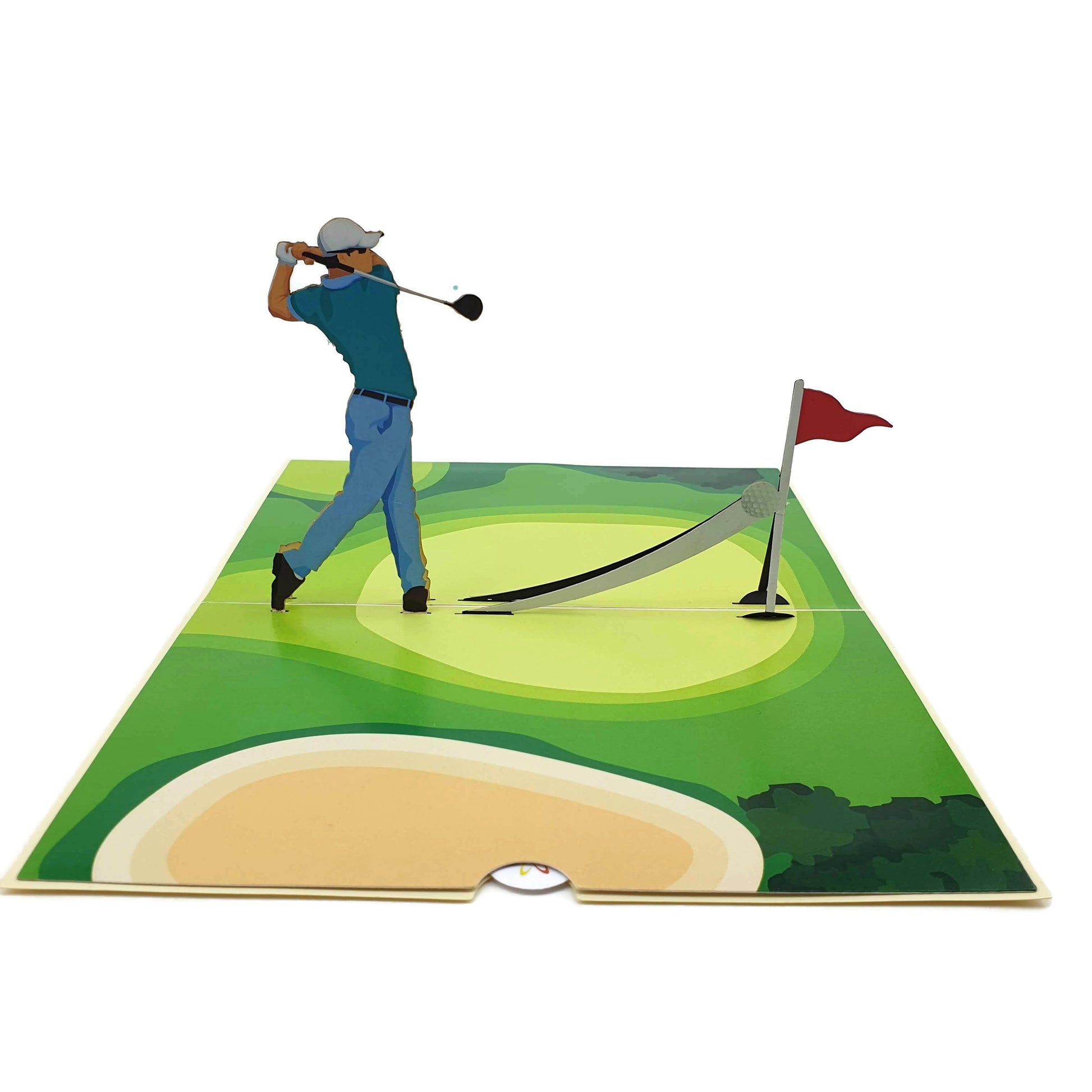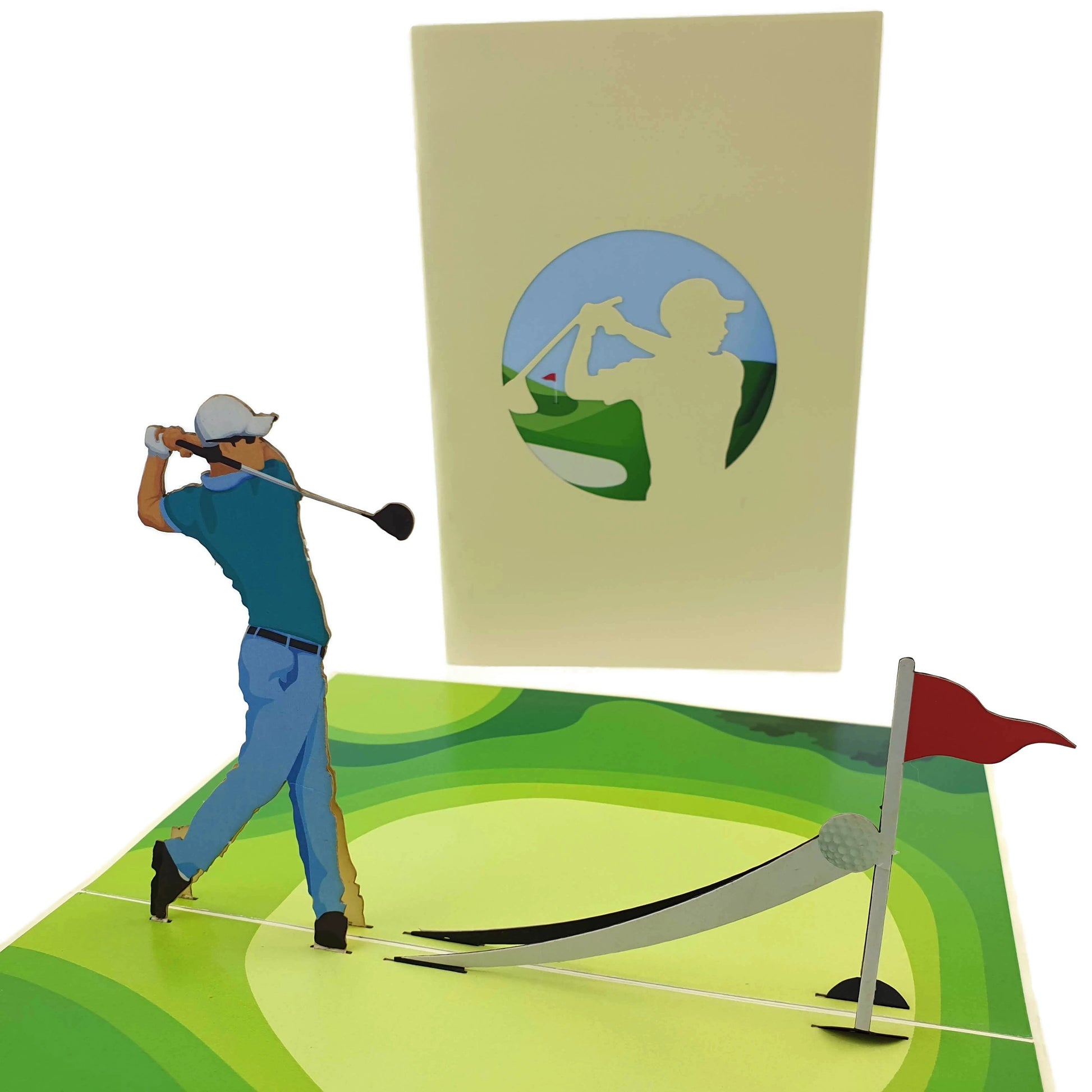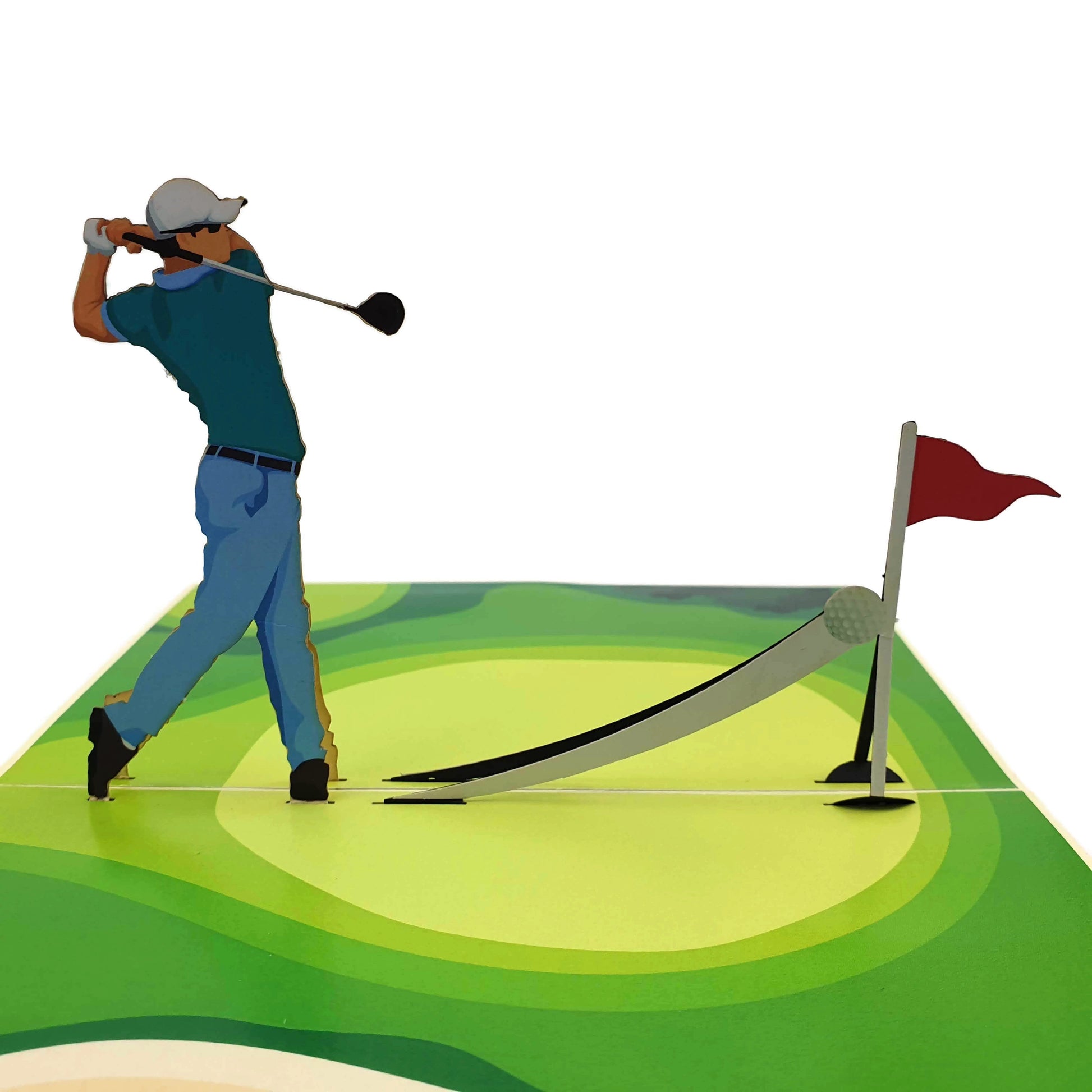 The front of this card features the outline of a golfer having just teed off, Open the card to reveal the same golfer with the ball in flight on its way to the cup (could he hit a hole in one?)