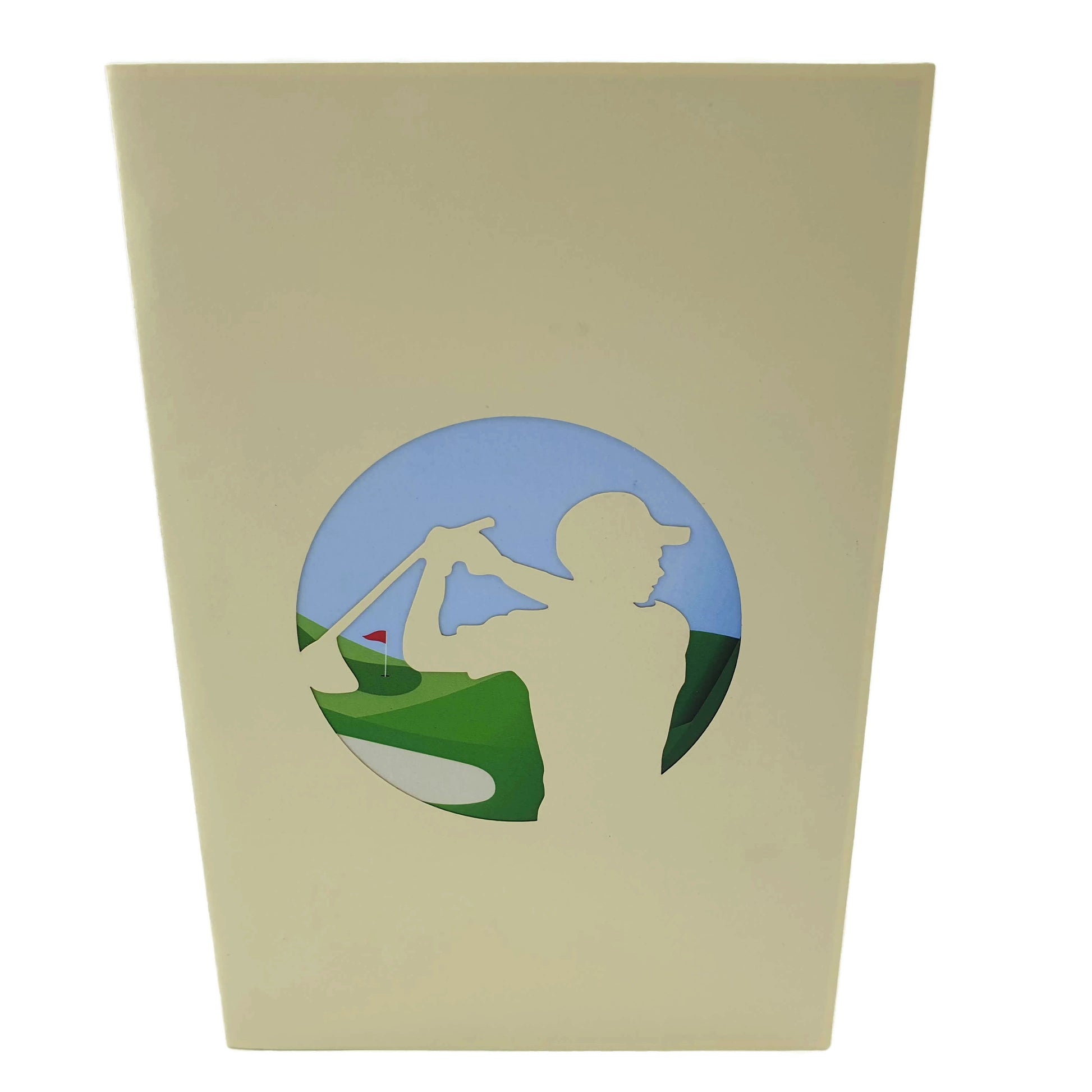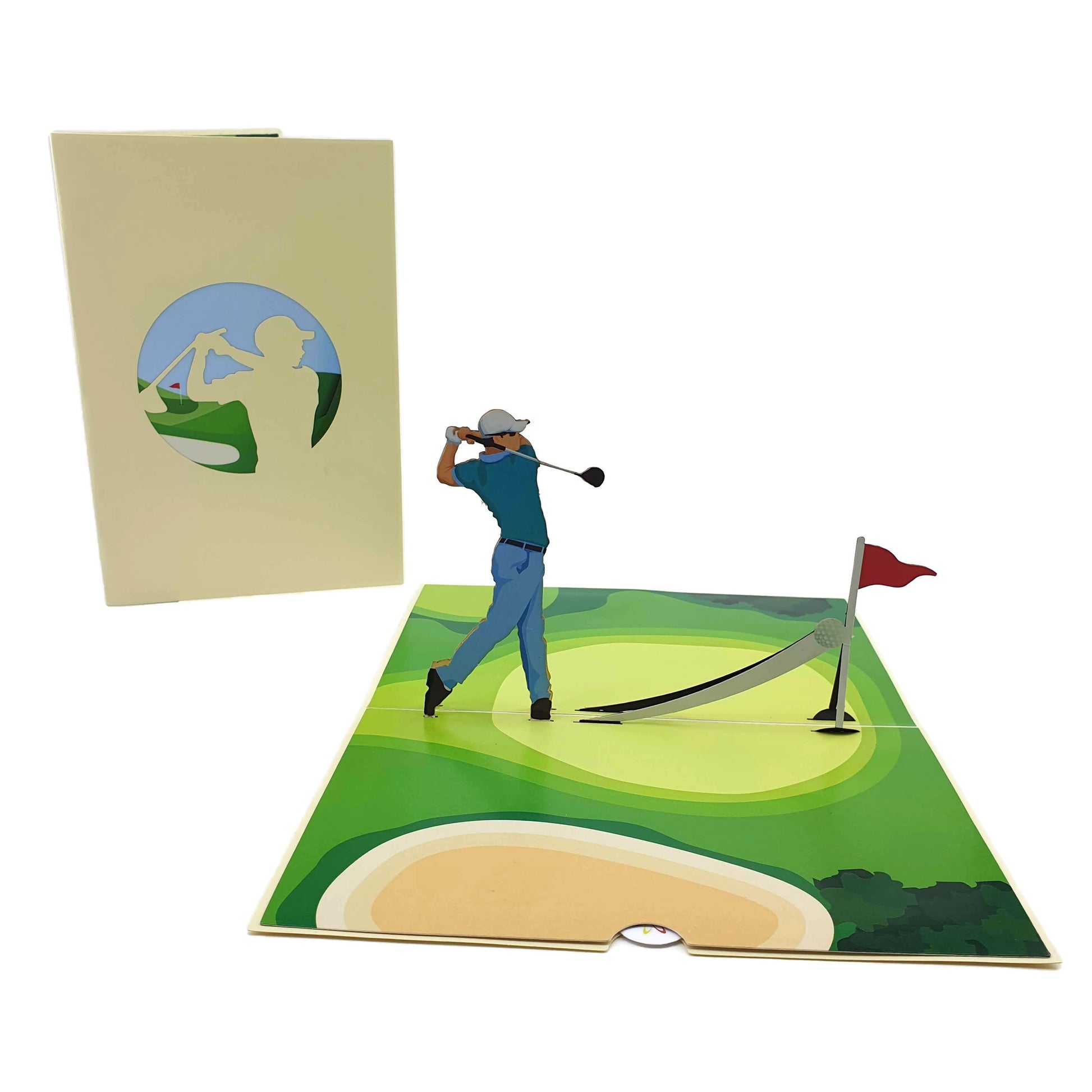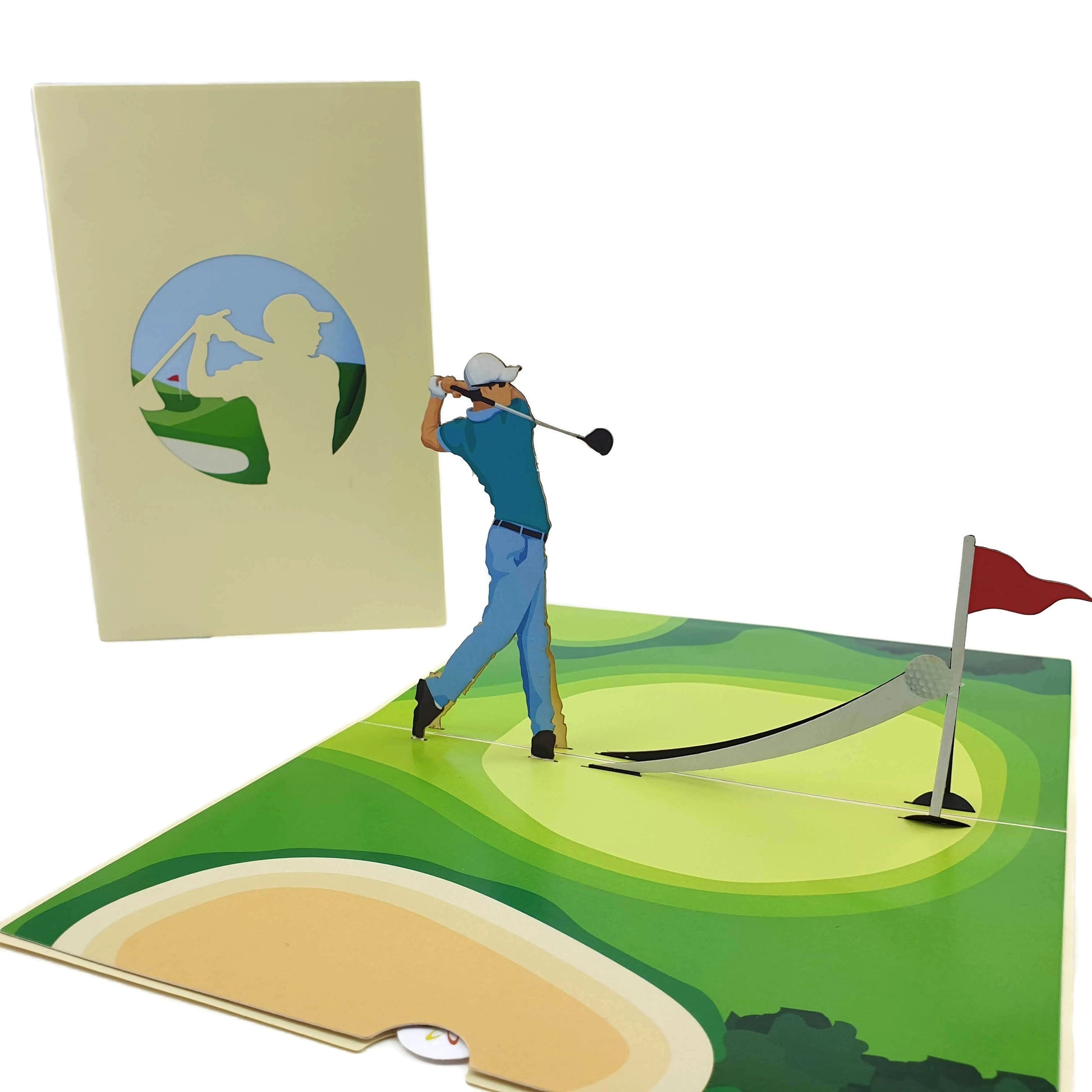 The front of this card features the outline of a golfer having just teed off, Open the card to reveal the same golfer with the ball in flight on its way to the cup (could he hit a hole in one?)