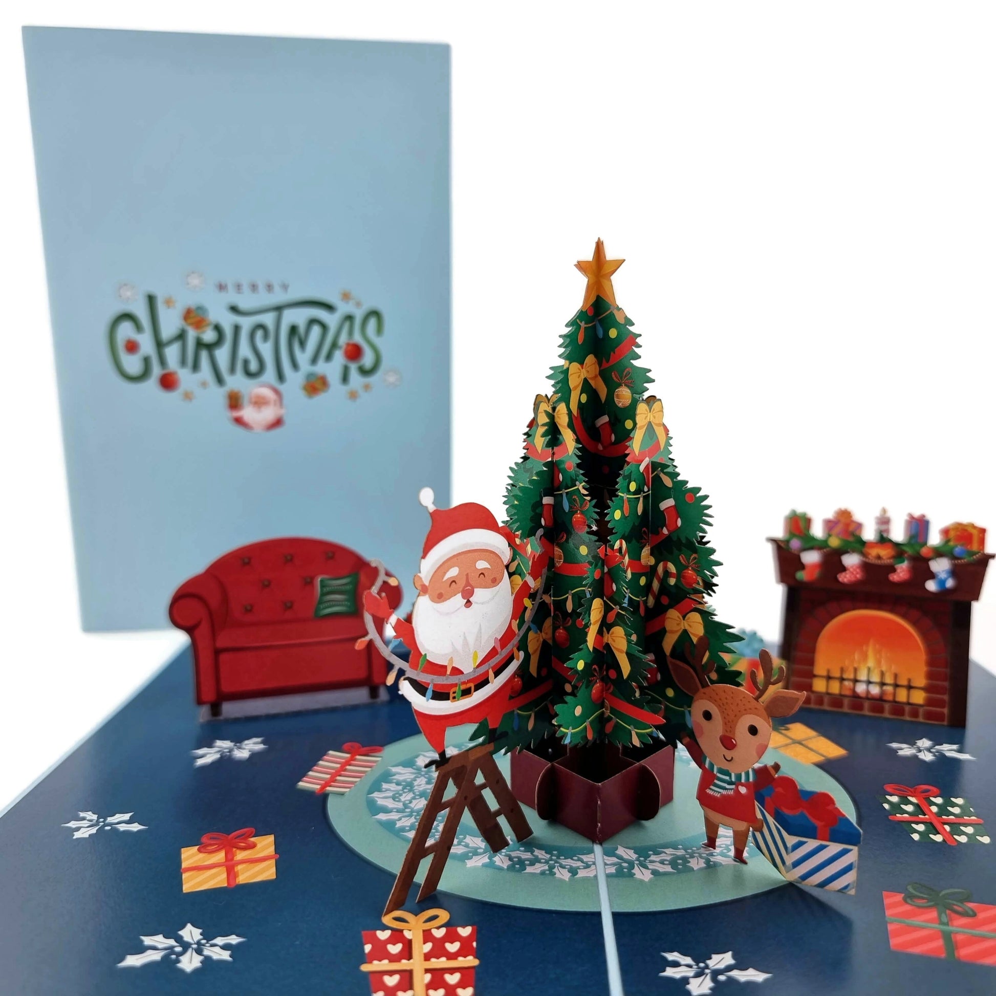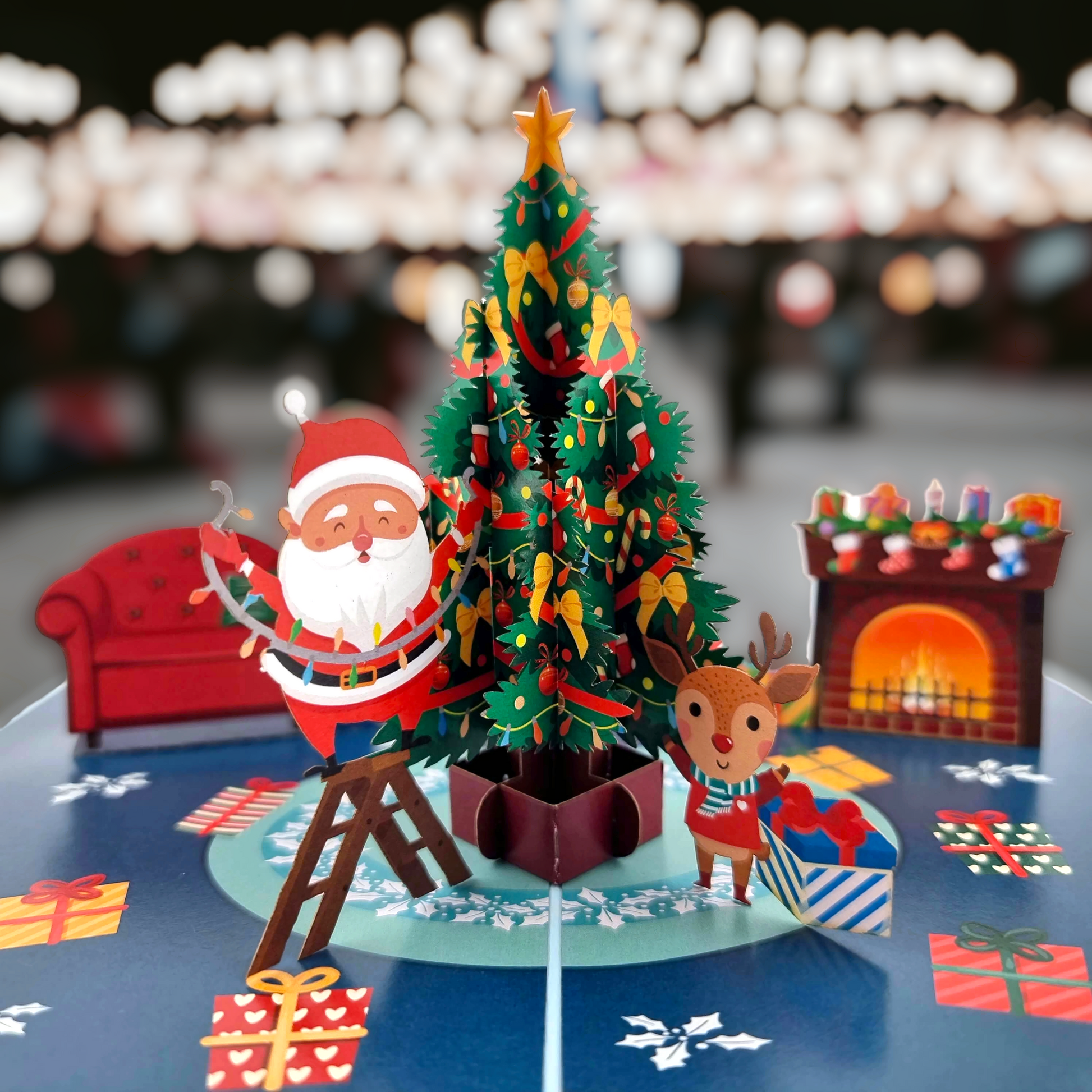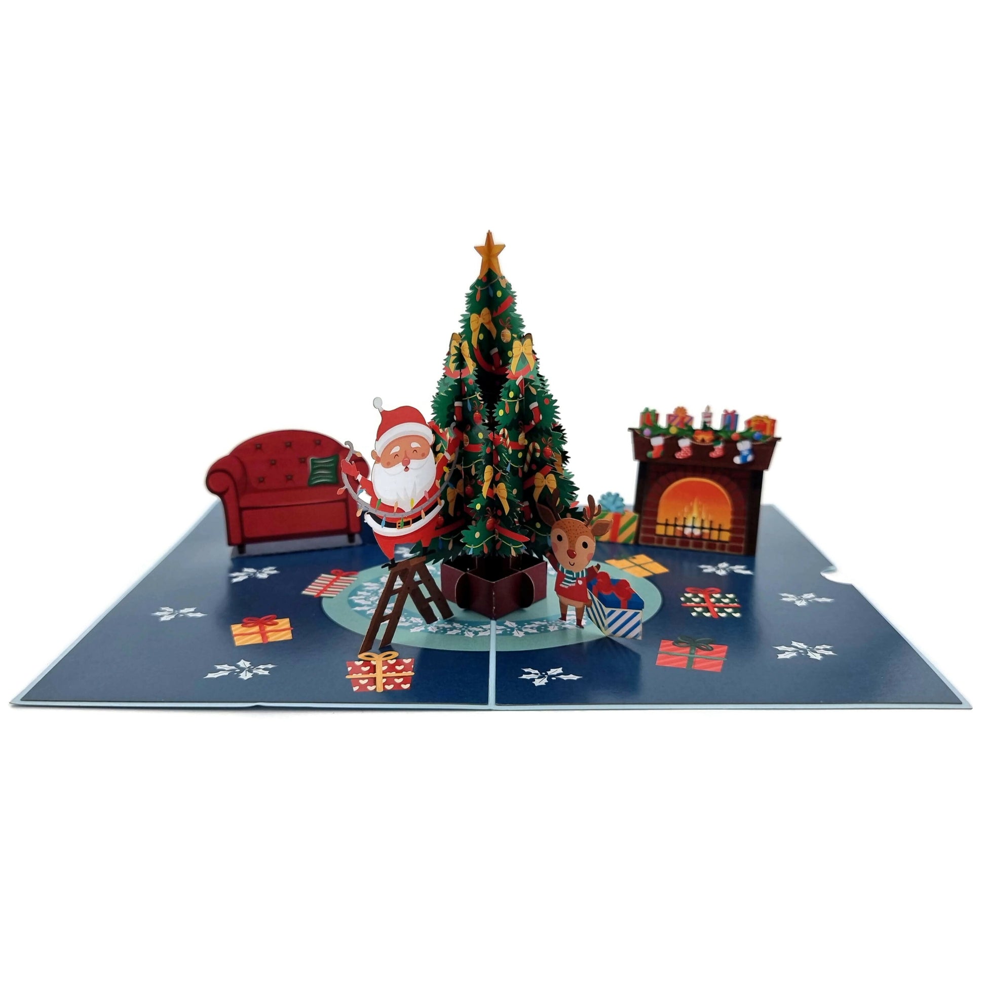 - This pop up card features Santa standing on a ladder decorating a Christmas tree with Rudolph's help.