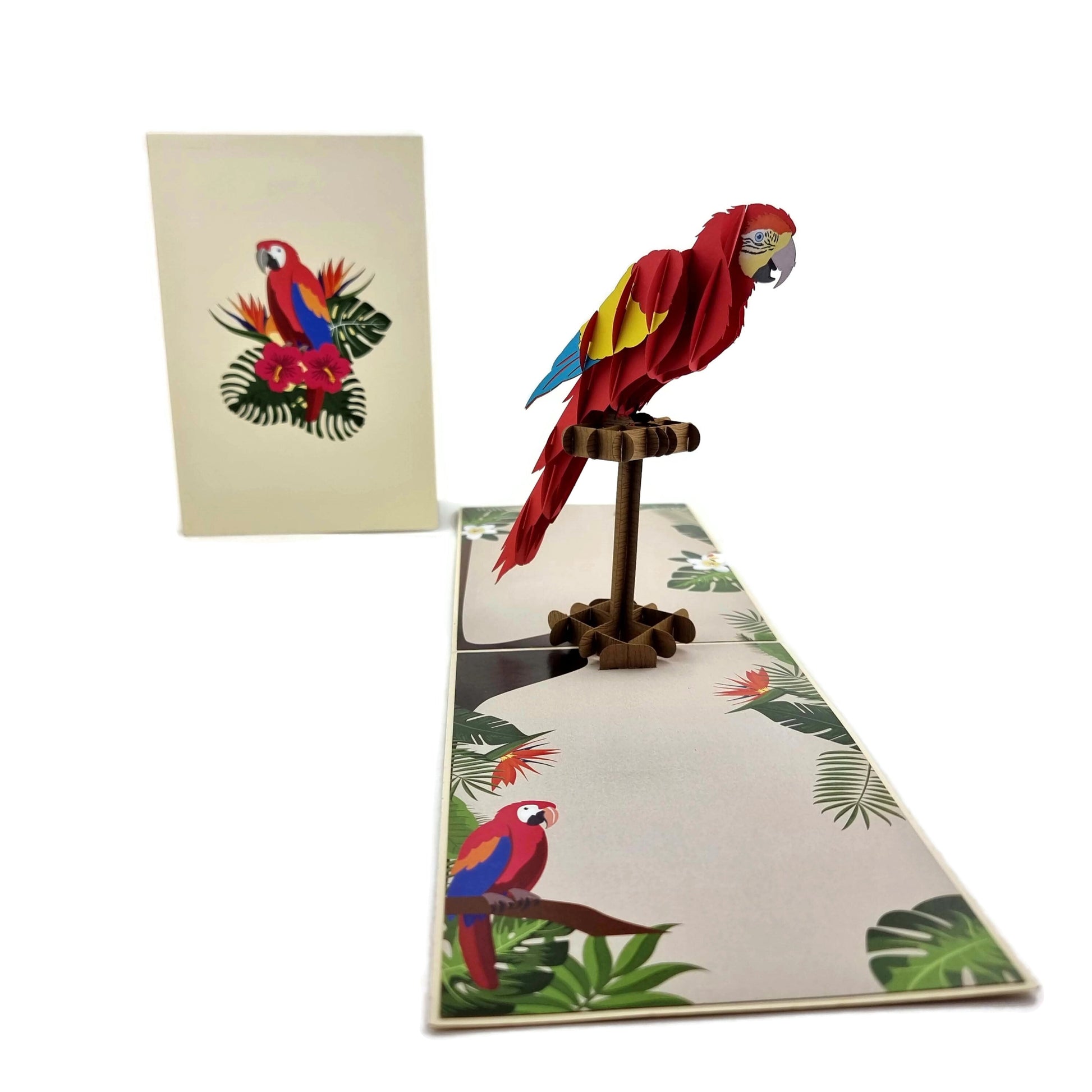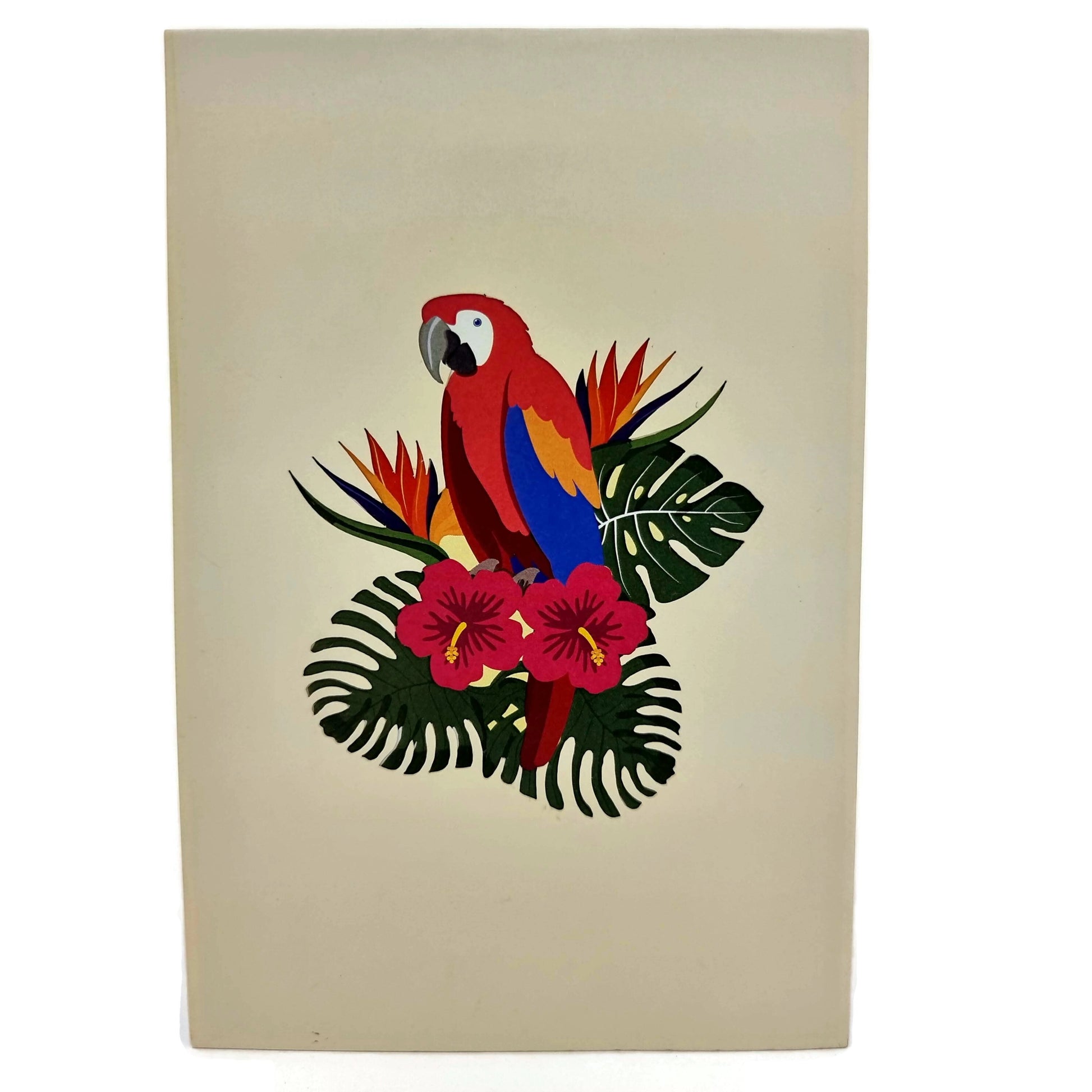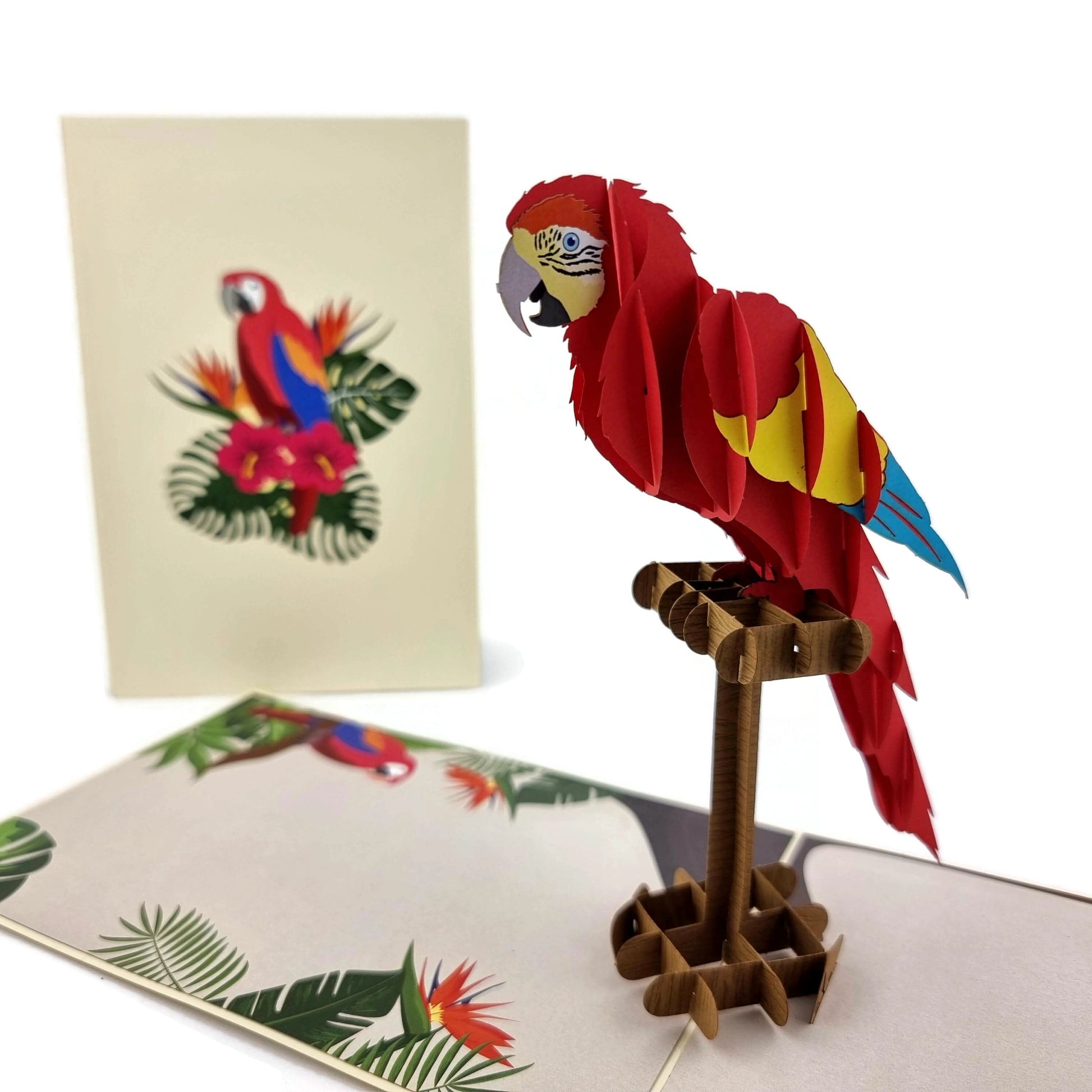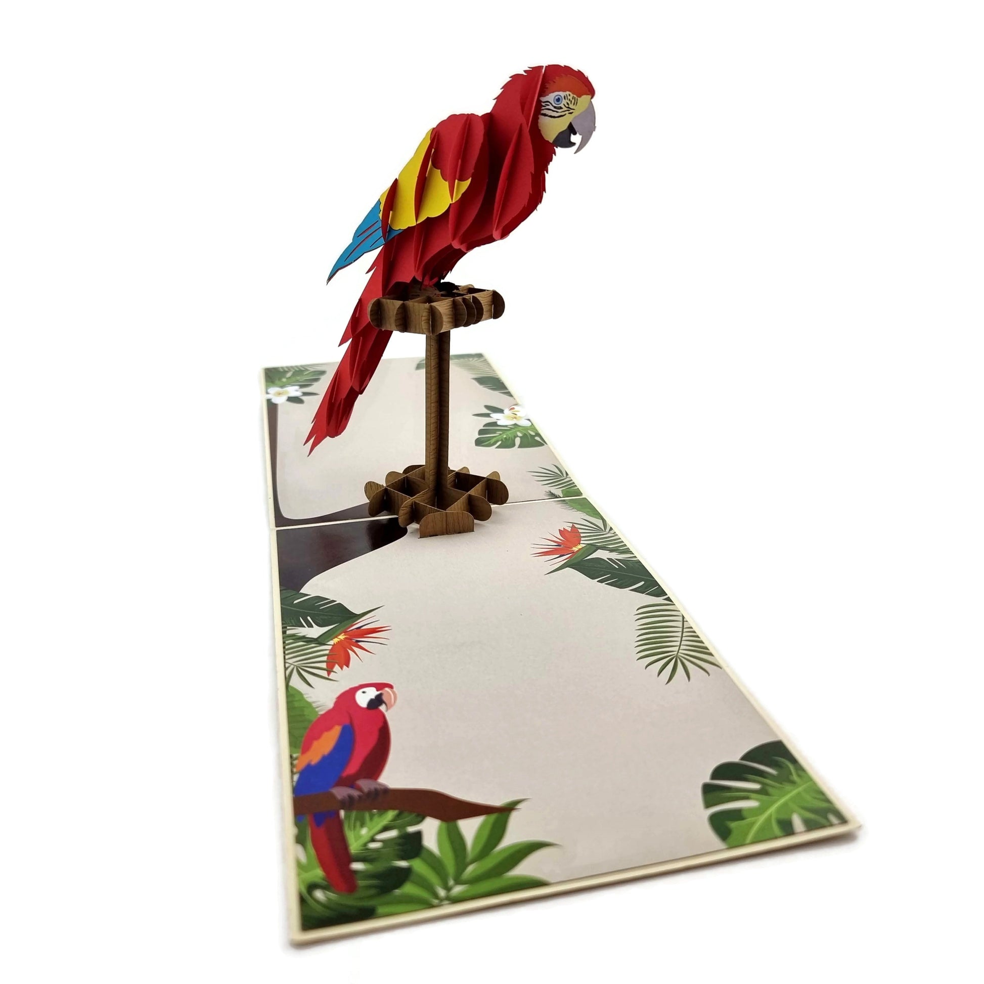 The cover of our Parrot card features a vibrant red parrot sitting on a branch. Open the card to find a red, yellow and blue parrot sitting high on a wooden perch.
