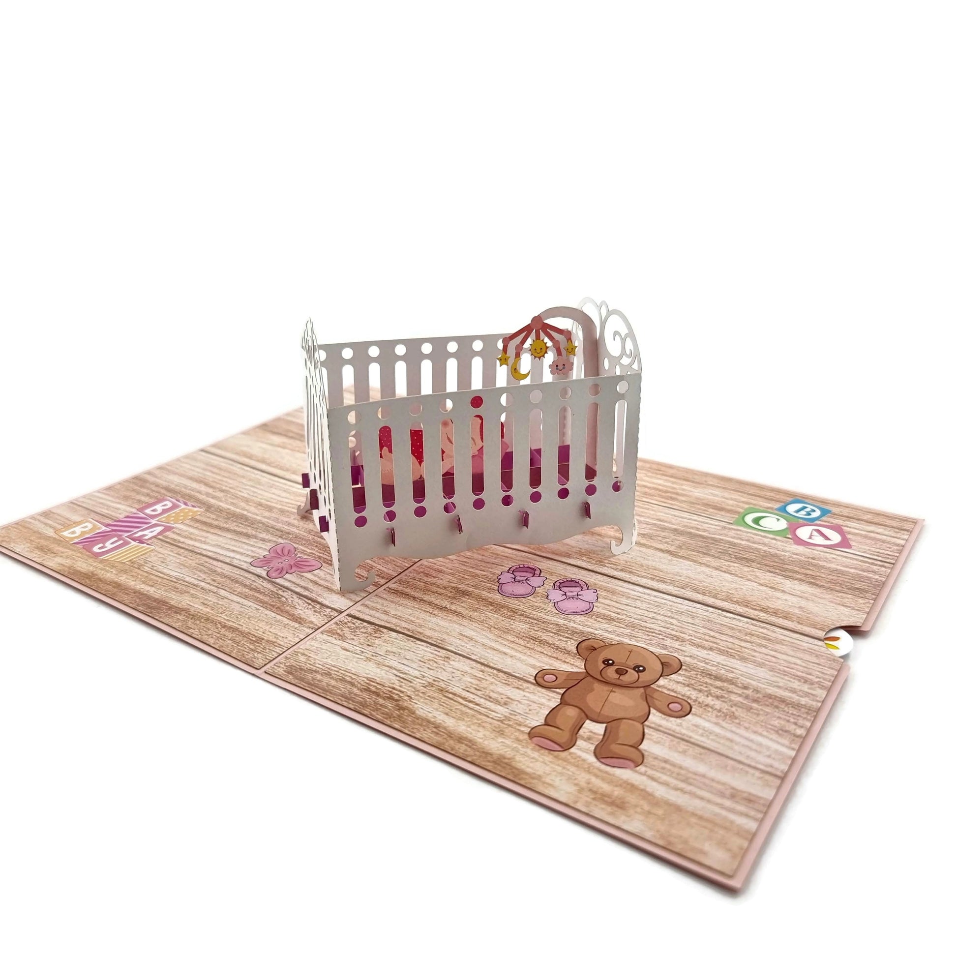 An outline of a cute baby sleeping with its head on the pillow is featured on the pink front cover of this cute card. Open the card to find the 3d cot with the new baby sleeping inside.