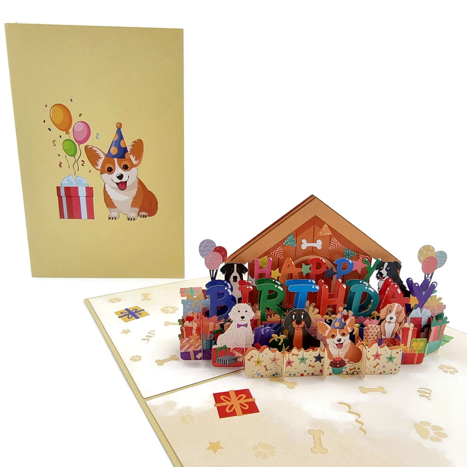 On the front, a pup sits alongside a present and festive balloons, pop open the card to reveal an amazing 3D "Happy Birthday" sculpture encircled by 6 mischievous canines, presents, balloons, and a kennel. At 12 x 18 cm (4.7 x 7 inches), the card also features a white envelope and a slide-out insert for your special message. Let your heartfelt wishes take flight!