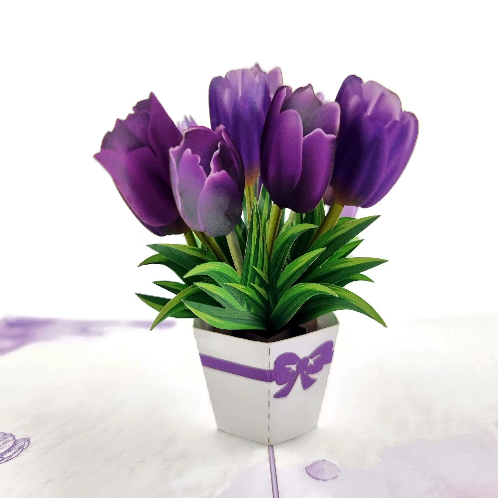 The cover of this purple card features an image of purple tulips, once opened the card reveals a gorgeous purple tulip bouquet inside a pot sitting with a beutiful background.