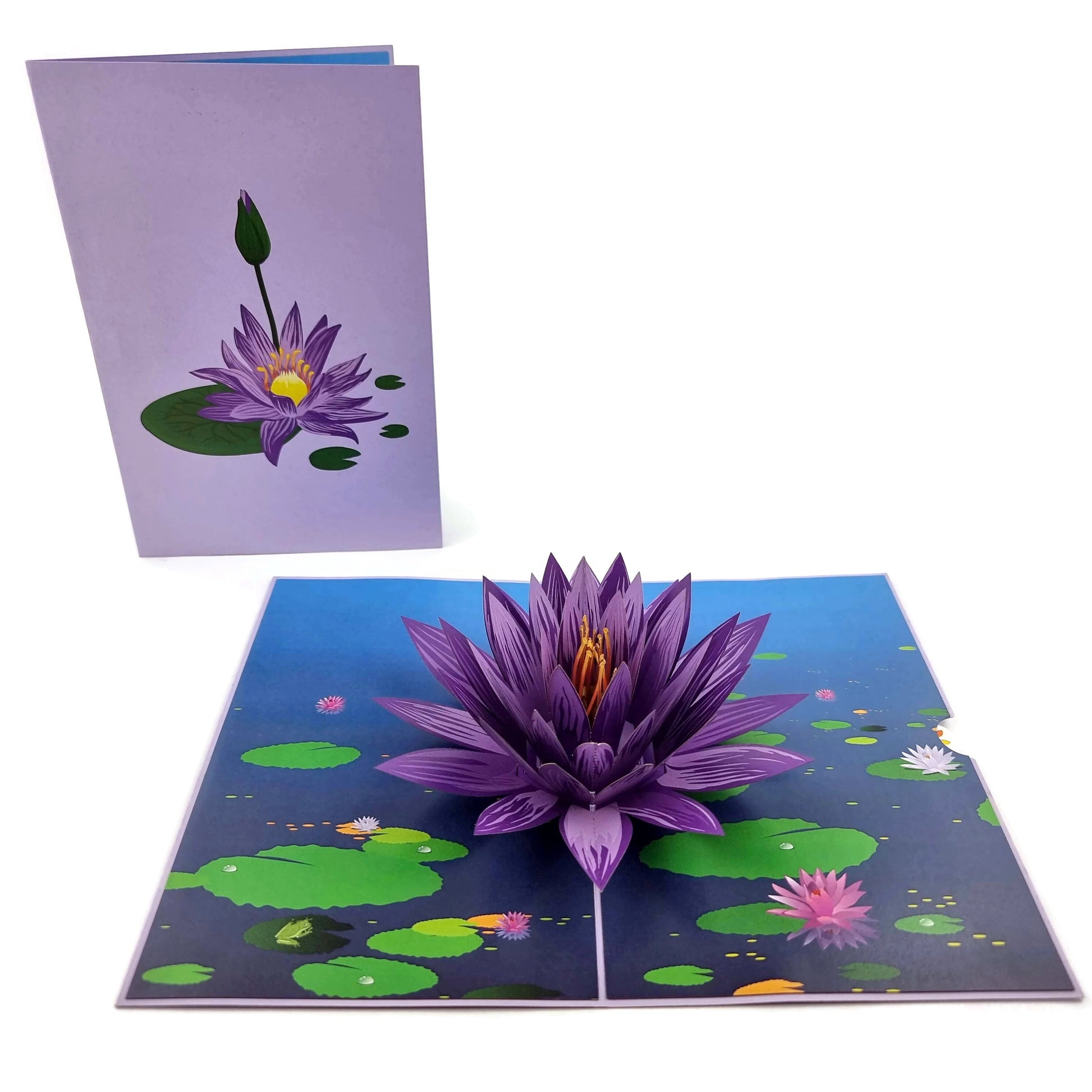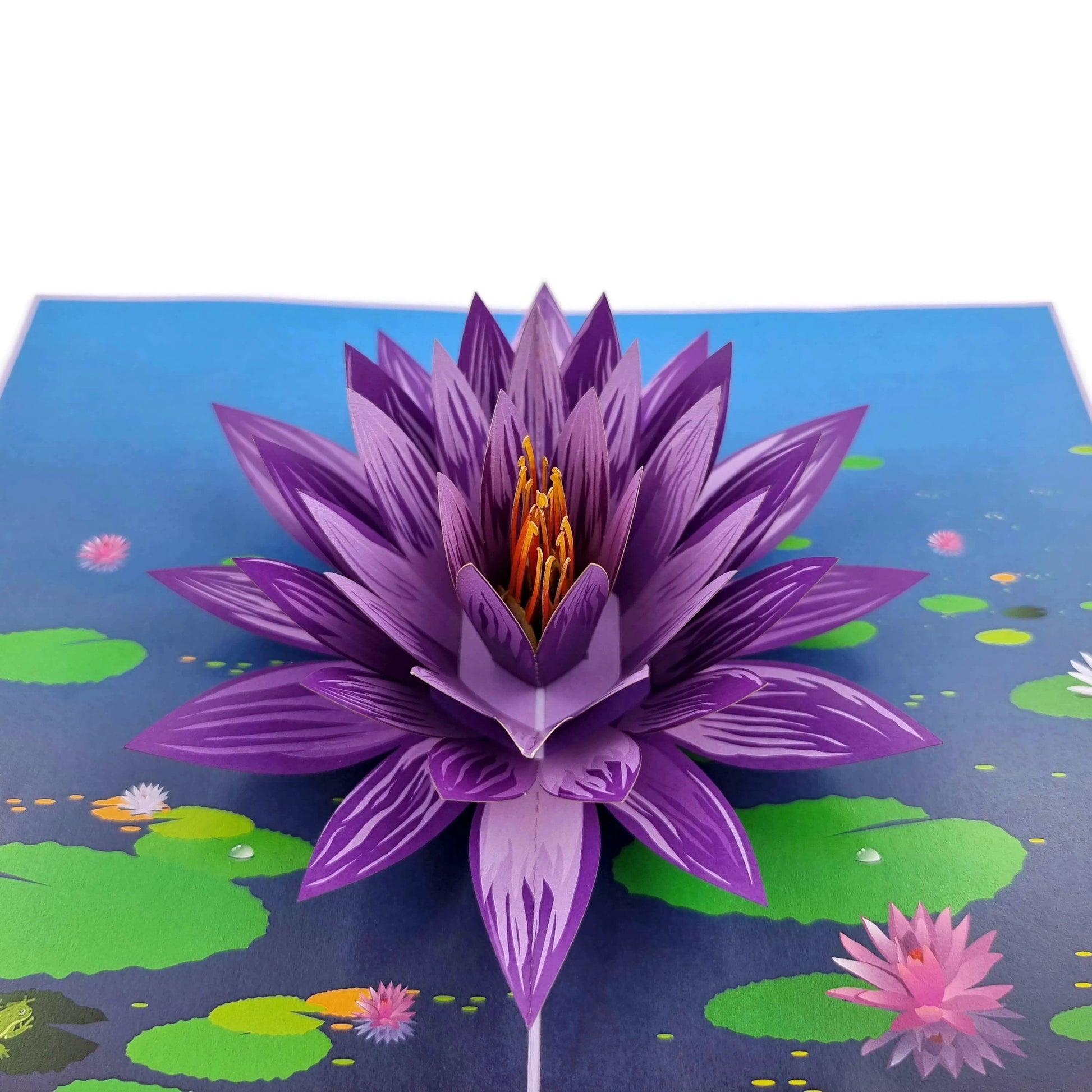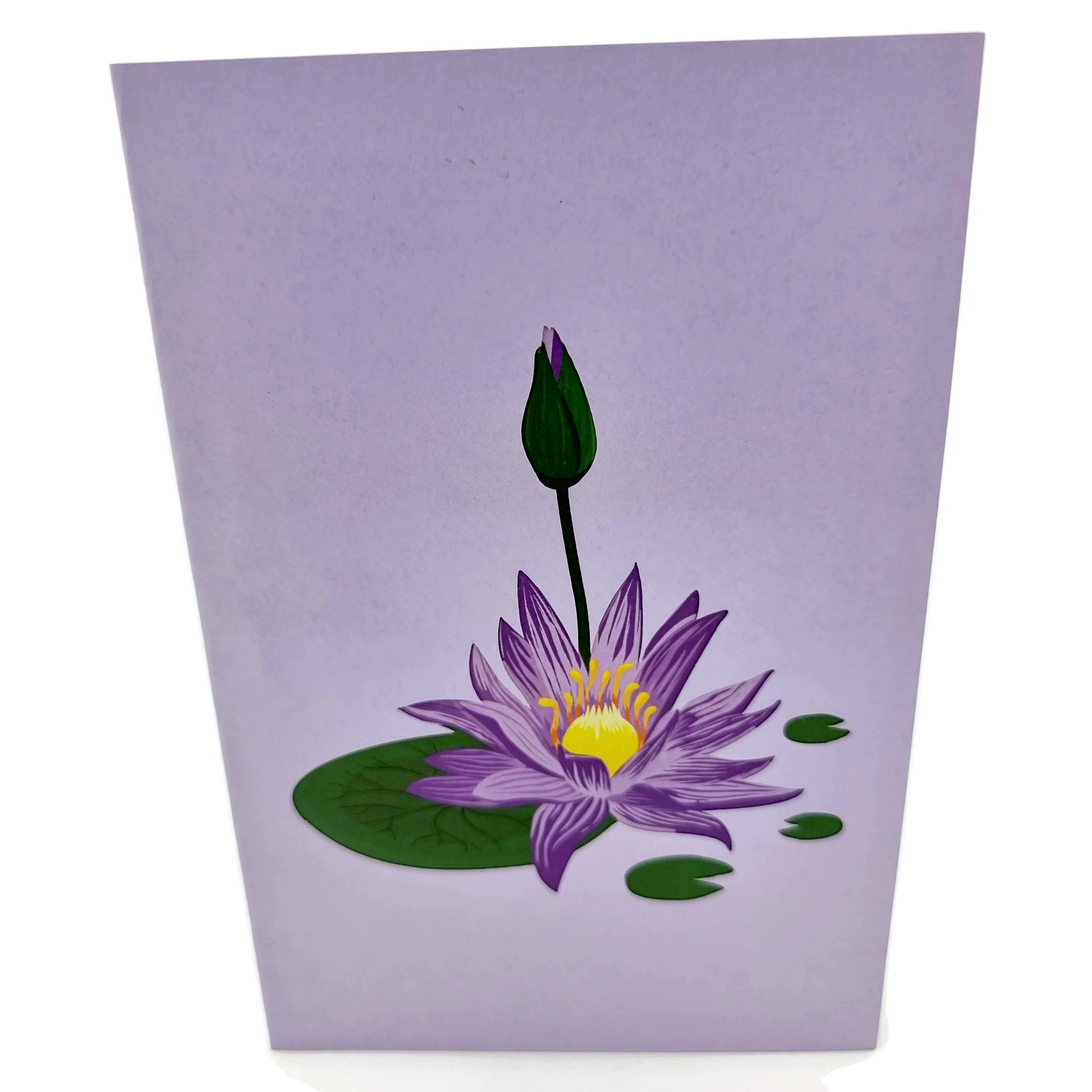 The cover of this beautiful card features a purple water lily. Open the card to reveal a red three-dimensional purple water lily sitting in a pond surrounded by green leaves.
