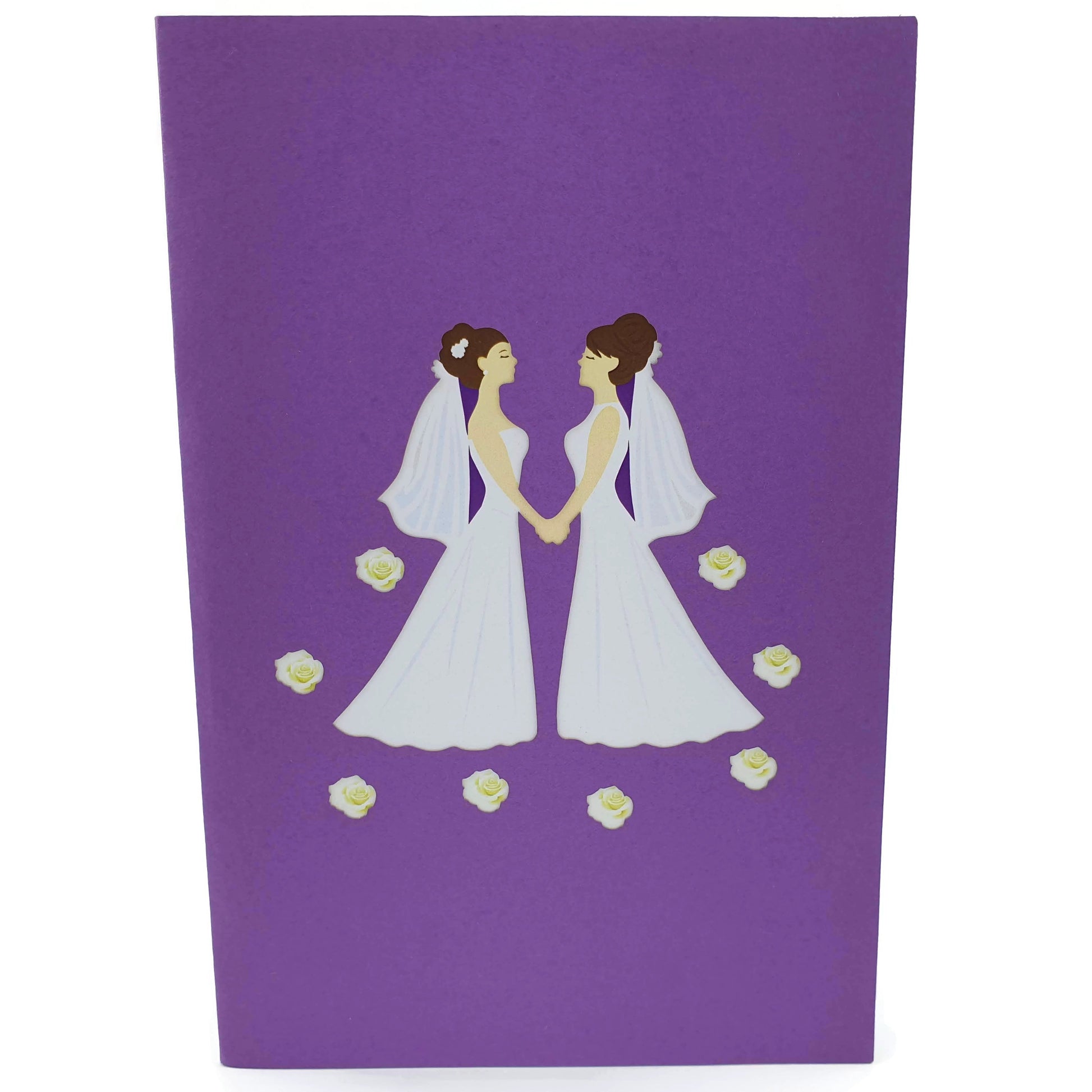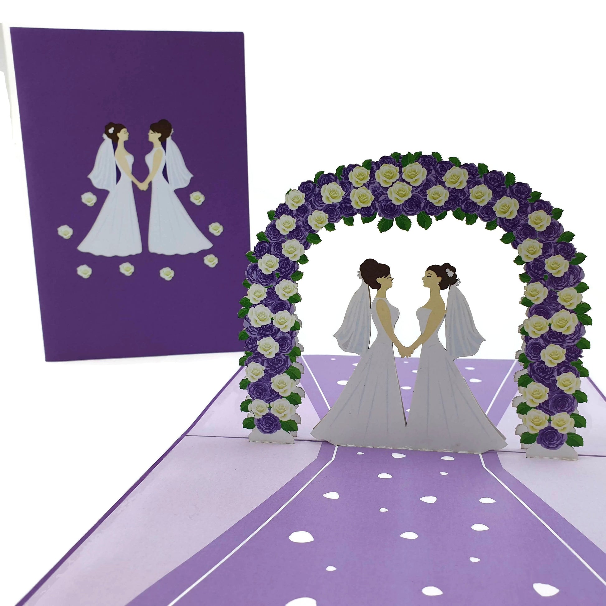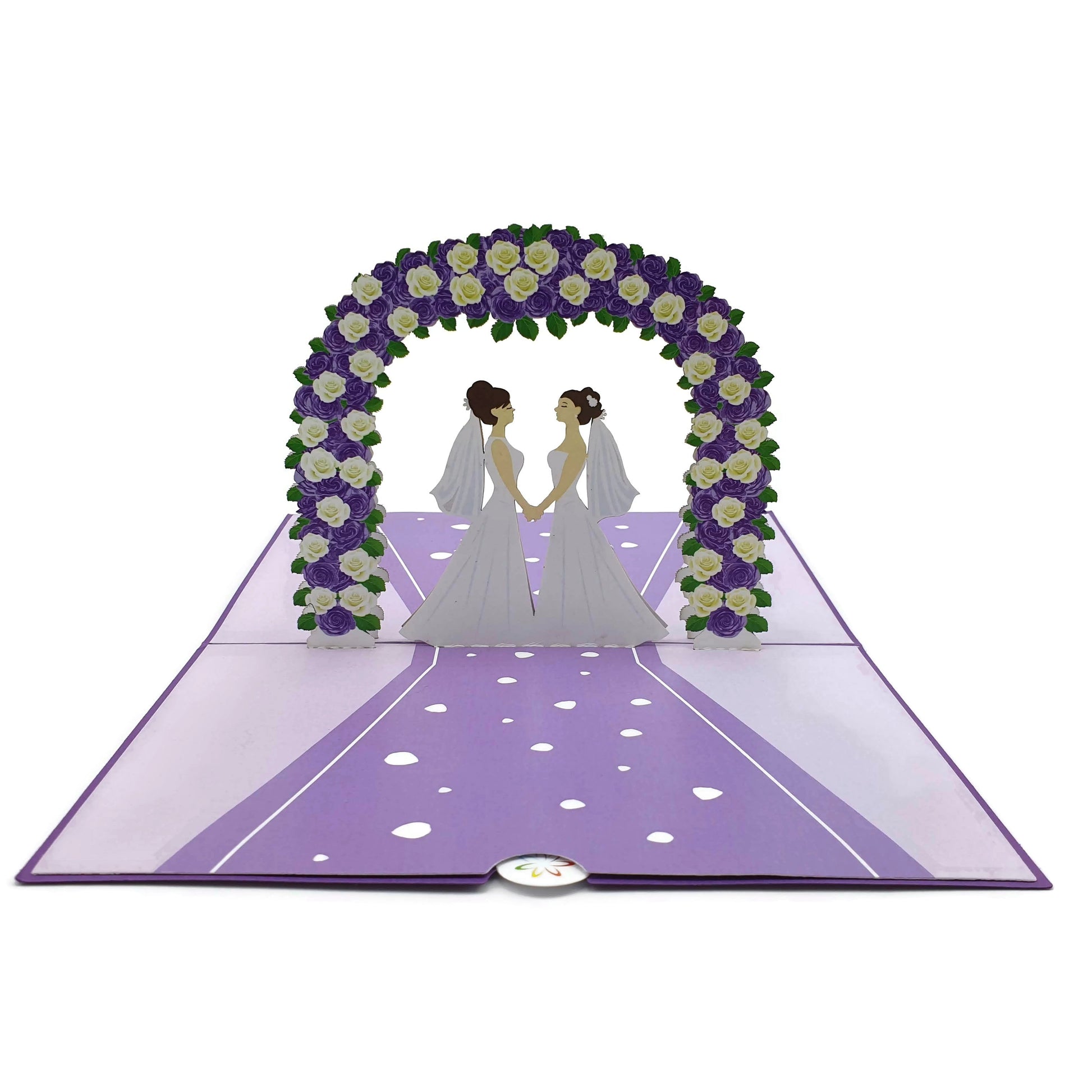 The cover of this wonderful wedding day card features a laser-cut illustration of a female couple in an embrace. Open the card to find two beautiful dressed brides standing under an arch covered in purple and white flowers.