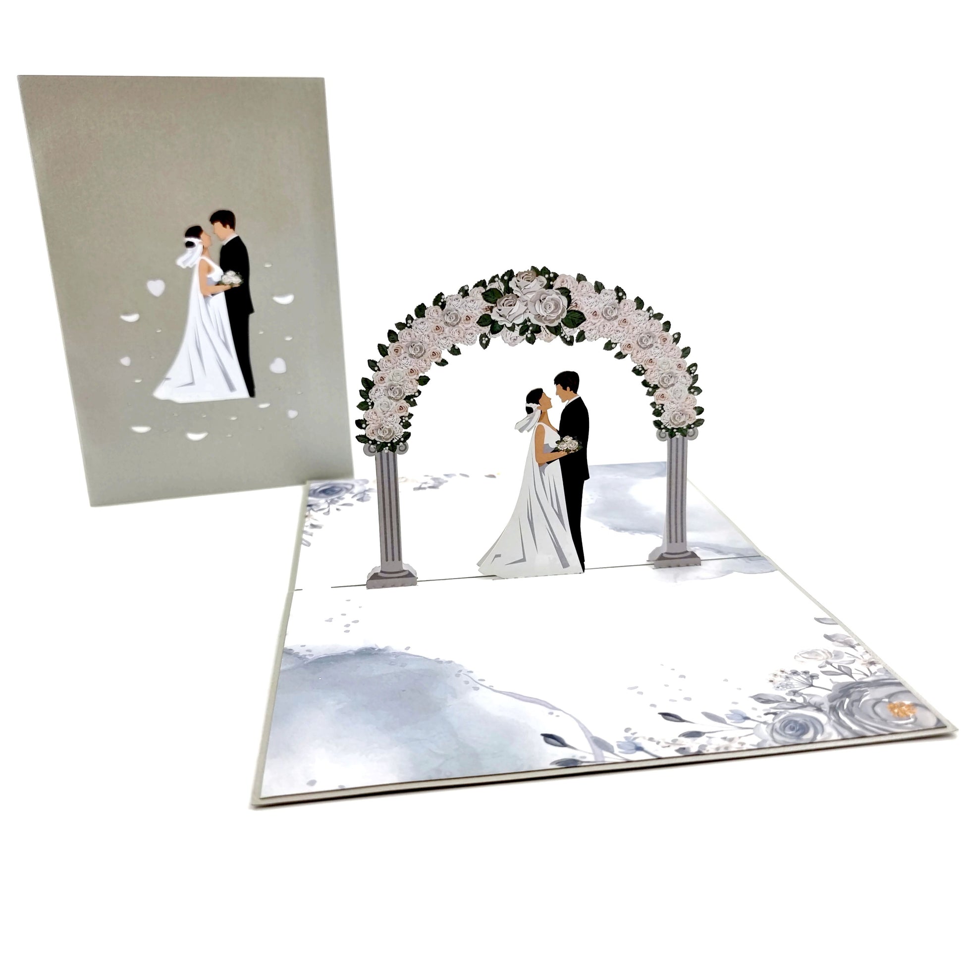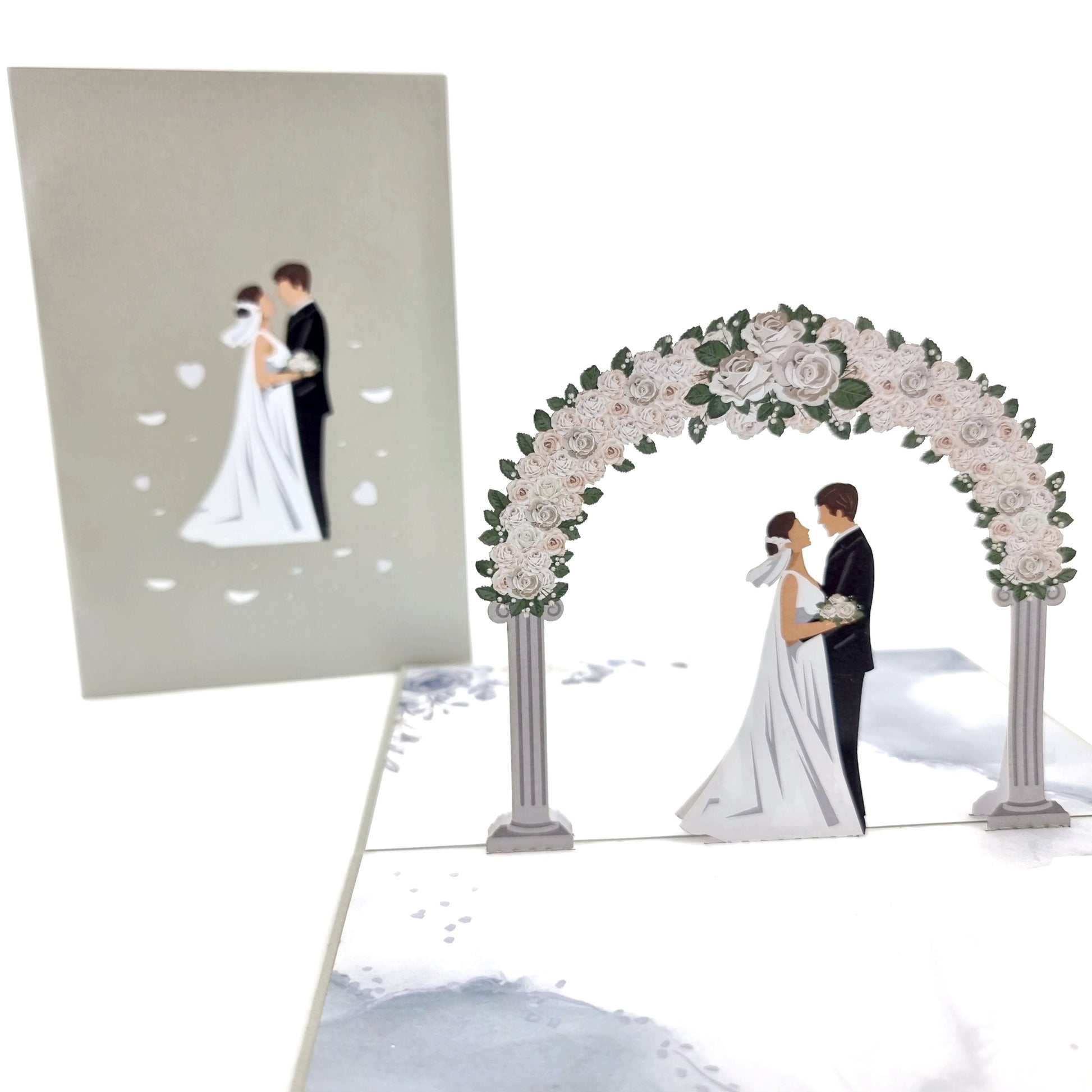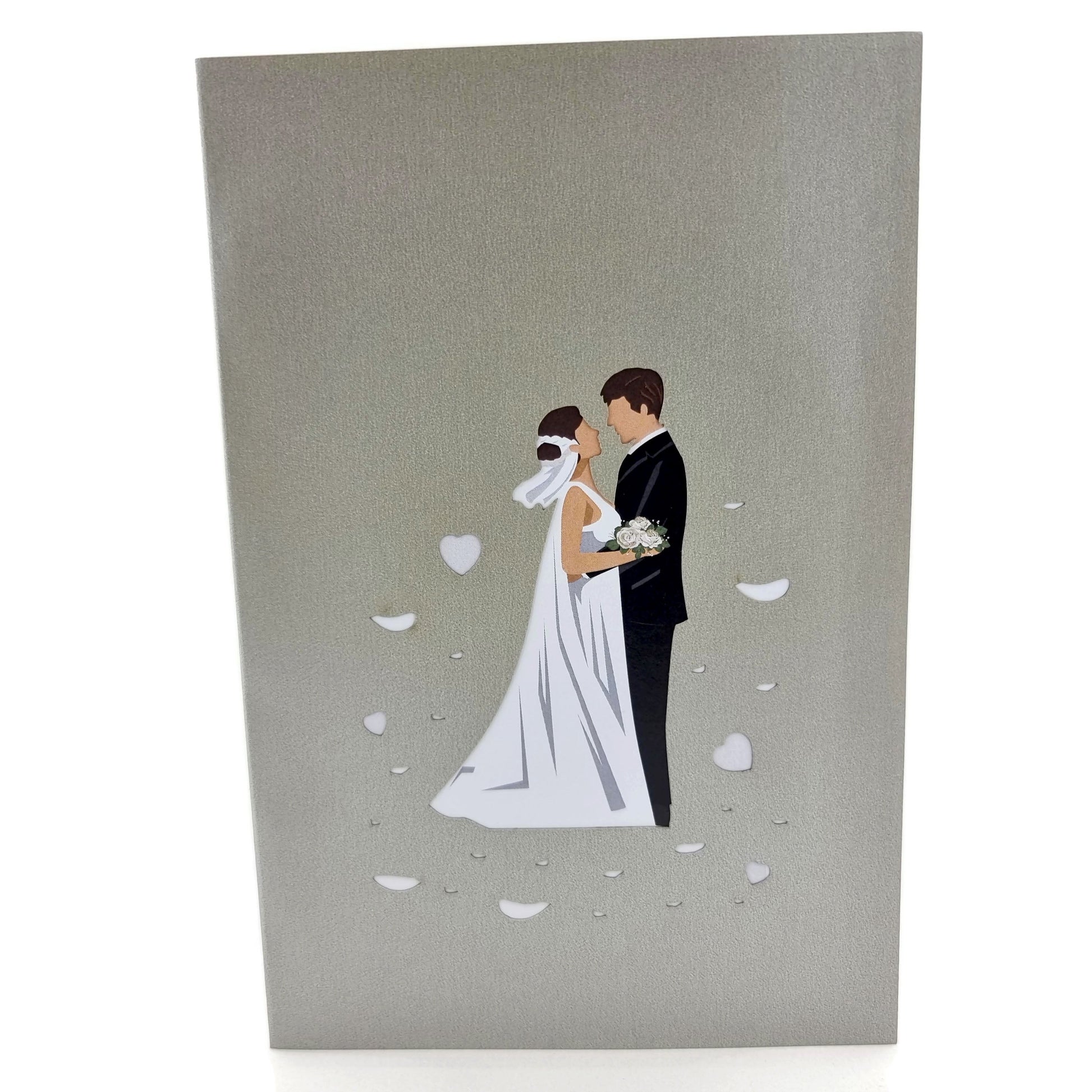 The silver cover of this wedding day card stuns with its laser-cut illustration of a loving couple in an embrace. Inside, the pair stands beneath an arch draped in snow-white petals - a truly gorgeous sight! This card is the perfect way to show your joy for the happy couple on their special day. Measuring 12 x 18 cm (4.7 x 7 inches), the card comes with a white envelope and a slide out note to write your heartfelt message.