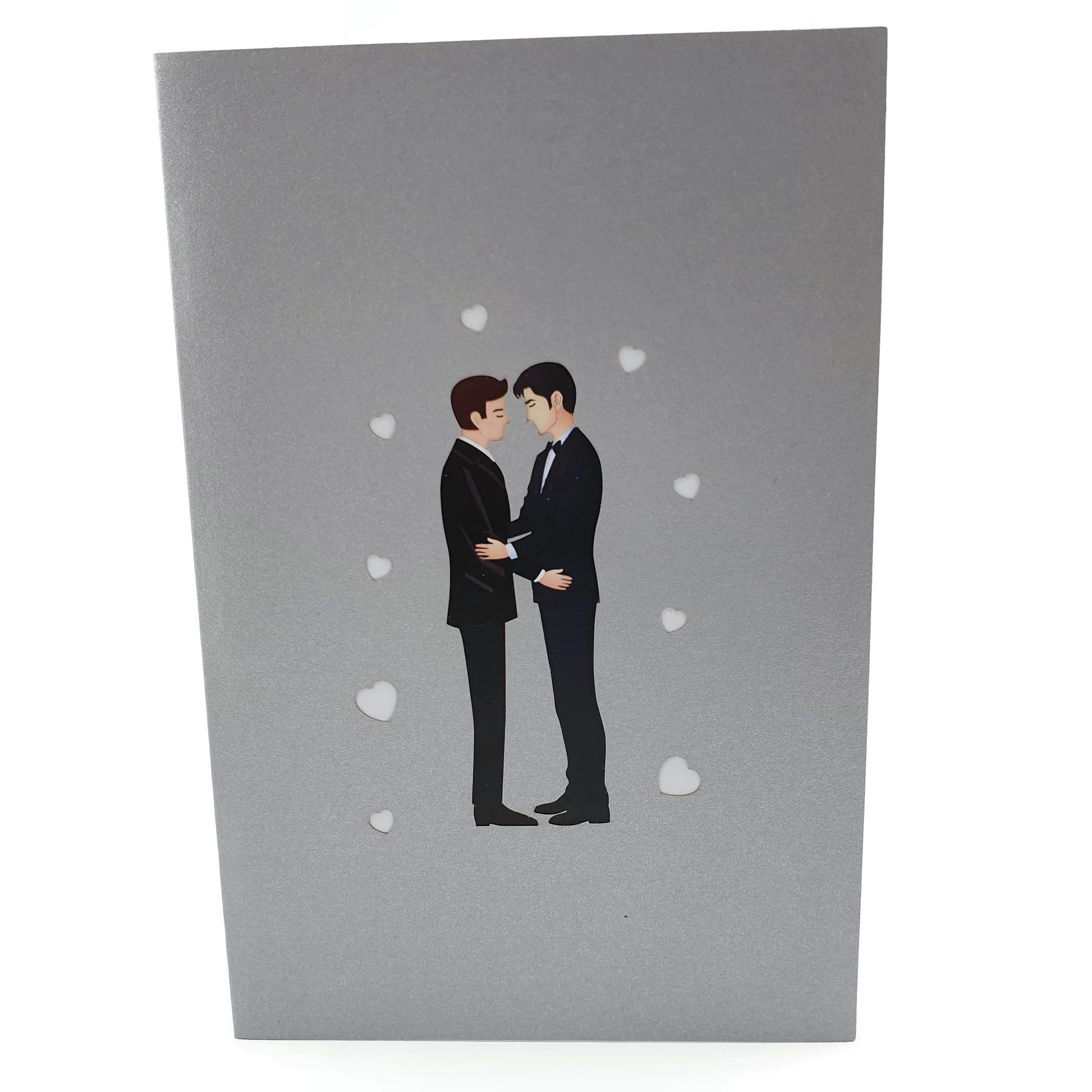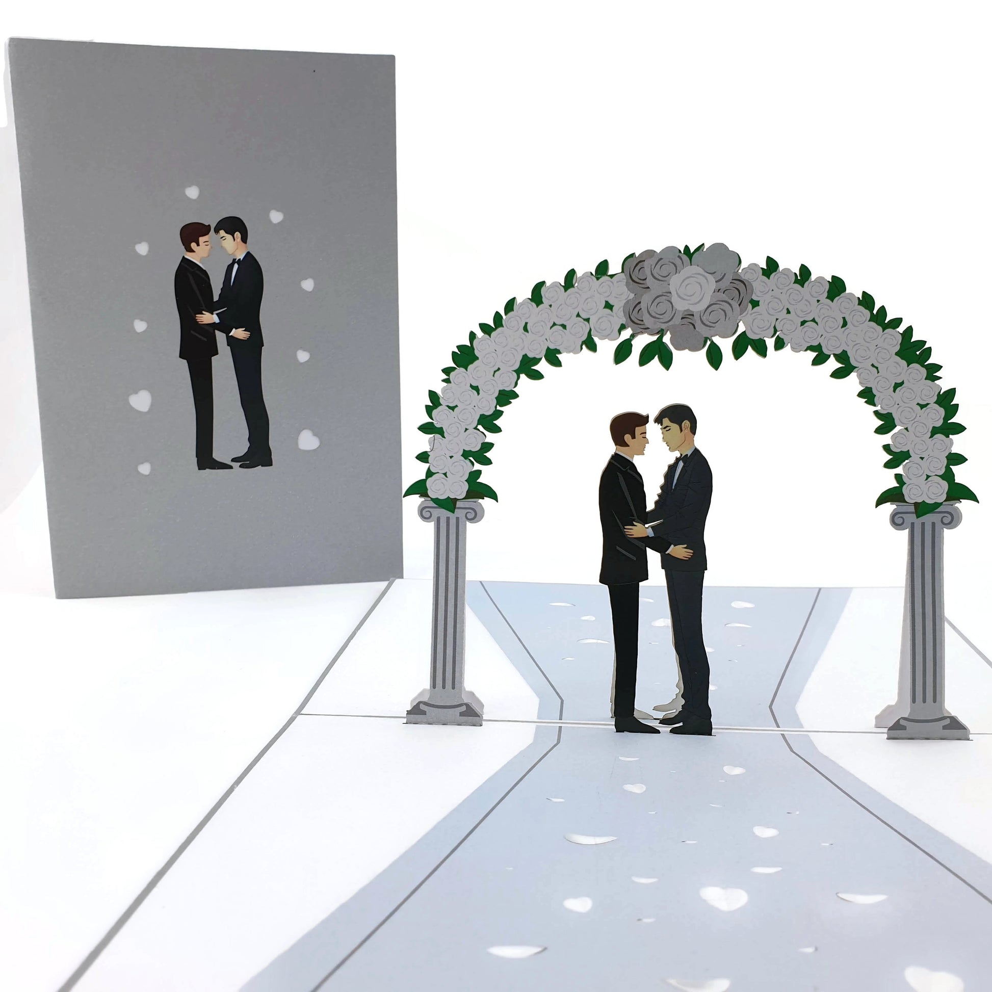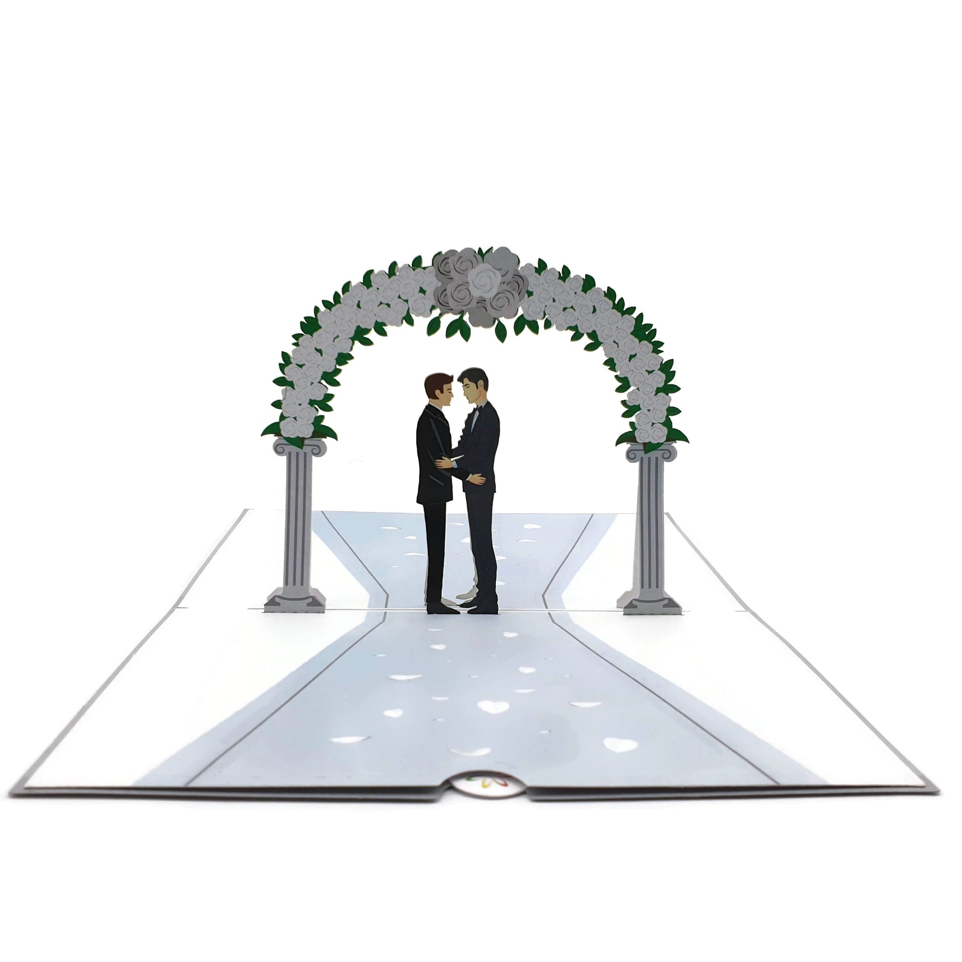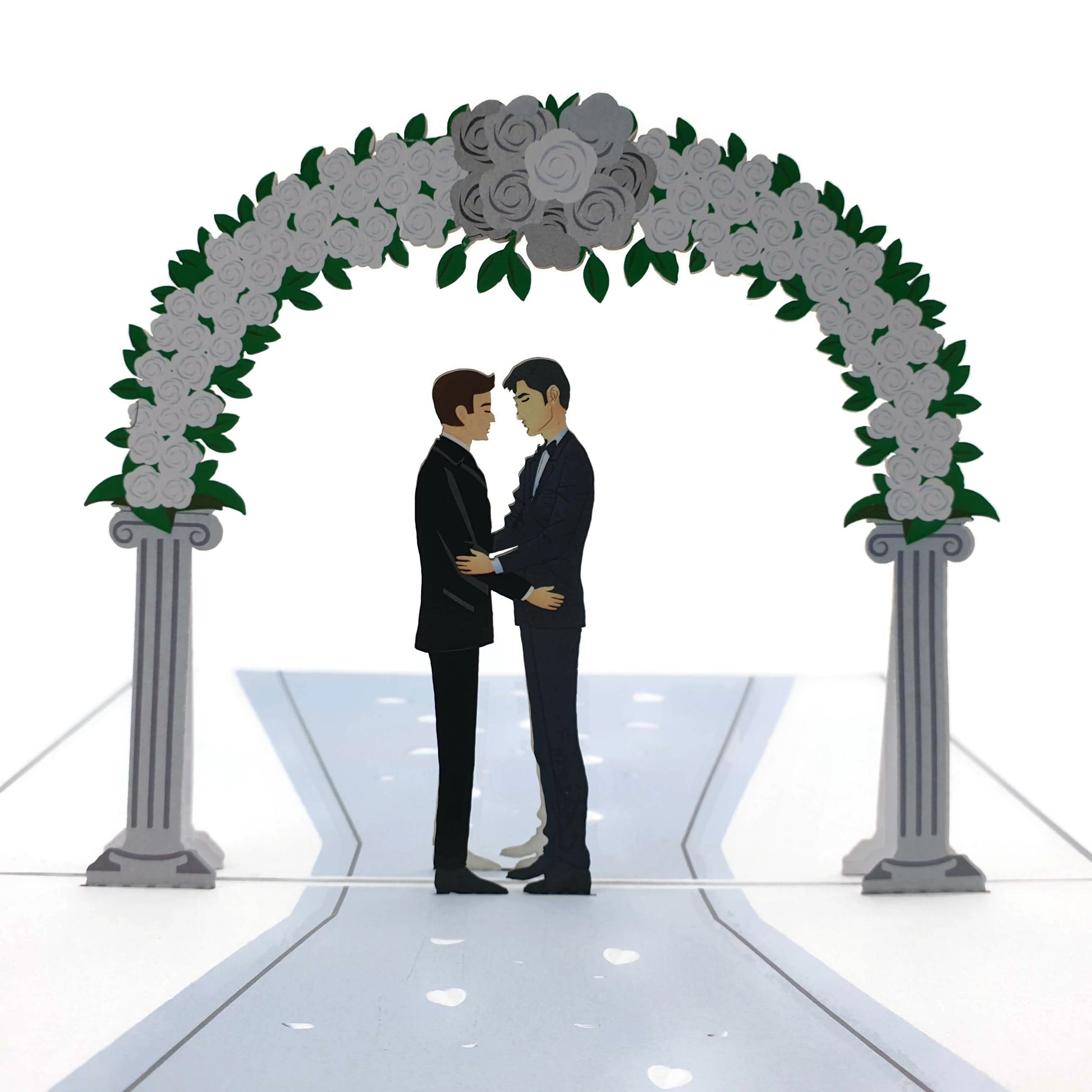 The cover of this wonderful wedding day card features a laser-cut illustration of a male couple in an embrace. Open the card to find two handsomely dressed grooms standing under an arch covered in white flowers.
